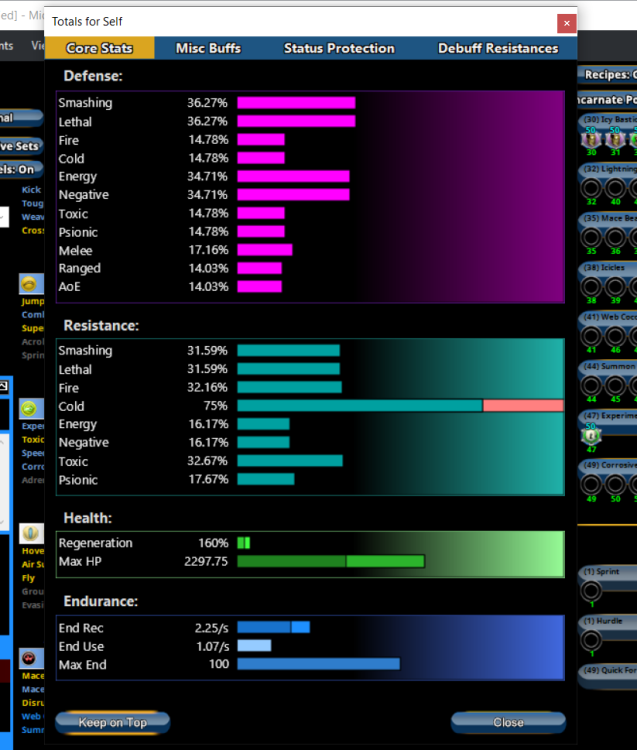 I'm enjoying this thread, thank you! I don't generally play tanks, but for some reason Ice Armor is one of the only defense-based sets that I enjoy on scrappers. Now, of course, this is going to play differently on scrappers and tankers, and that's not just because of the incredible power that is Icy Bastion. I've been working on a base template for what I would want to slot out of Ice Armor, and I'm still working on getting over my bias towards positional defenses rather than typed defenses. For end game builds I will focus on: Frozen Armor, Glacial Armor, Weave: attuned Lotg +recharge, 2x lvl 53 cyto. No set bonuses, but lots more endurance help than I would get otherwise. Hoarfrost: 5x Panacea 50+5 (all except proc). Chilling Embrace: 2x D-Sync Deceleration lvl 53. I've no objection to putting damage procs in there if you have room, but I usually don't. Wet Ice: 50+5 Endurance Reduction IO. Energy Absorption: Shield Wall Def, Def/Rech, Def/End/Rech, all at 50+5, 2x lvl 53 D-Synch End Mod/Rech, Energy Manipulator %stun. This is certainly overtuned. Permafrost: Glad Armor proc and Glad Armor Res, Res/End, Res/Rech at 50+5. Icy Bastion: Glad Armor Res and Res/Rech 50+5, Panacea Heal and Heal/Rech 50+5, 2x lvl 53 D-sync End Mod/Rech. Also: Combat Jumping: Lotg Rech, Kismet proc, Shield Wall proc, Reactive Defense proc Tough: attuned Steadfast Protection +def, 4x Unbreakable Guard (Res, Res/End, Res/End/Rech, proc). Health: Panacea proc Stamina: Perf Shifter proc With no other set bonuses, I am working off a base of: With one opponent and Energy Absorption active I get an extra 5.3% defense and more with more opponents, and when Icy Bastion is active resistances are basically maxed for all except psionic (which is admittedly awful at 17.7%). That's a lot of room to have to play around with set bonuses from my offense! I'm looking forward to continuing to learn more on how to build for Ice Armor.