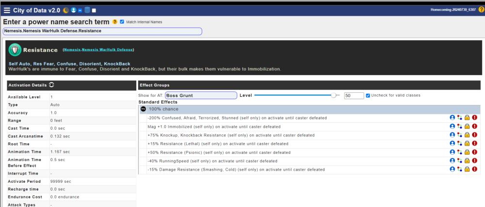 8. Keep in mind the difference between mez magnitude and mez resistance. Magnitude for PvE is generally going to match up with the rank of the enemy -- bosses are mag 3, which means they will not be affected by a mez unless it is higher than 3 or unless it stacks higher than 3. How long it does effect them is going to relate to their mez resistance, and I'm not 100% on the mechanics of that. I know, for example, that if a player has 100% resistance to a mez effect, then it cuts the time in half. However, there also seems to be a shortcut for some enemies, for example: https://cod.uberguy.net/html/power.html?power=nemesis.nemesis_warhulk_defense.resistance&at=boss_grunt Warhulks are listed as being immune to fear, confuse, disorient, and knockback, but vulnerable to immobilization. This manifests as an automatic +1 mag immobilize (so that you only need to stack with something greater than 2 to immobilize), a +75% knock* resistance (which I don't really understand), and a -200% confuse/afraid/terrorized/stunned (which confuses me again). I'm working off the assumption that the -200% is a shortcut to immunity because maybe -100% isn't enough in some circumstances, but this is not the same as, say, a +200% resistance, which if a player had would reduce the time of the effect to 1/3 regular time.