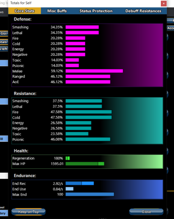 13. One of the things I enjoy about this game is learning new things, and sometimes that thing is that I was looking at things in a different way than perhaps others were looking. I have never liked defense-based armors (Ninjitsu, Super Reflexes, Energy Aura, Stone Armor -- somehow I'm ok with Ice Armor). What I have telling myself for years is that I don't like them because it is easy mode -- you soft cap your defenses and there you are. However, I've been spending time on my WM/Ninjitsu scrapper and finding that dinging 50 and playing at +4/x8 *feels* much more difficult than it does on say, a WM/Bio. Why would that be so? I'm softcapped to all relevant defenses so only 1 in 20 blows should be getting through. And hitting the T9 shouldn't *majorly* affect my survival, since still only 1 in 20 should be getting through, but it really does. And *smacks forehead* of course, the purple patch. Before I get level bonuses from T3 incarnates, my effective defense is not 45%, not at all. And I'm so used to playing multifaceted armor sets that I'm used to proactively healing or boosting my defense or whatever, and not having those tools in pure defense sets are killing me smalls. Another thing that I forget about incarnates (and I don't pursue them on all my 50s) is that lots of my endurance woes go away once I hit Radial Musculature and Ageless. So I do see what some of you are saying that I'm overbuilding for endurance, but I'm overbuilding for my *future* endurance. As of now, I'm firmly in what I consider the sweet spot, but once I T3 I suspect I'll respec again.