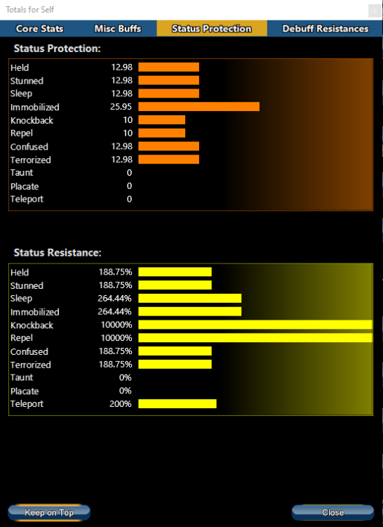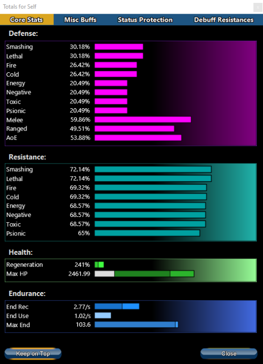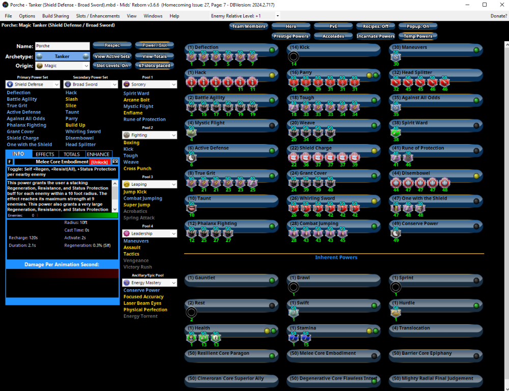 This is my current build used by Porche of Chaos United on Everlasting. I figure I should share what I have done since I have benefited a lot from other's build guides and guidance. Its the result of about a year of active play and a couple of revisions on my first ever level 50 main. It can tank 4-star ITF, and its balanced all-around protections make it capable of handling any enemy group in the game without holes. As always if you have suggestions or questions let me know. Pros: Positional defenses are soft capped naturally All resists at about 70% self-buffed Four different Mitigation buttons to cycle through (Rune of Protection, One WIth the Shield, Melee Core, Barrier Core) Capable of going AFK mid-pull in MSR raids and being fine Cons: A heavy defensive build means the Offense suffers Uncapped balanced resist means needing mitigation buttons to hit caps so a bit more active No self-heals or drains, don't expect to tank Hamidon Build Theory This is a build focused on balanced defenses. Although I could have capped certain resists, I instead chose to take a balanced approach and get everything up to a high level. The result is ~70% resistance across the board. This makes the build capable of handling ANY content without struggling. It can take on Freakshow as easily as Council and CoT. I have not had any I use the mitigation powers and cycle through them to maintain my resistance. Because Barrier Core Epiphany T4 lasts the full 2m with an effect that gradually loses power, we have a minimum of an extra 7% resistance. The same is true with Melee Core, which gives a minimum of +16% for an extra +23% resists, making for all practical purposes 90% resist all (Psi at 88%). All of this is self-buffed. Active Defense is our Status Protection, and it will refresh 11 seconds before it wears off, ensuring 100% uptime. Mitigation Buttons Rune Of Protection, +25% resist all, 10pt Status Protection One With The Shield, +45% resist all, 21pt Status Protection Melee Core, 16%-25% resists all (scaling with enemies) Barrier Core, 57%-7% Resists/Defense scaling down over the full duration Parry, +15 Melee Defense Pools Sorcery gives me my Movement power, a minor teammate buff, and Rune of Protection (Resist) as a big mitigation option. Fighting pool is pretty obvious for Tough (Resist) and Weave (Def) Leaping for Combat Jump (Def) Leadership for Maneuvers (Def) Energy Mastery gives me Conserve Power as an option if Endurance gets tight. Incarnates: Resilient Core to boost my resists Melee Core as a mitigation option Barrier Core as a Mitigation Option Degenerative for the -MaxHP Mighty Radial Final Judgement for the Knock up Cimeroran Lore for thematic reasons Endurance Use This build just sips endurance, All of the toggles and Active defense up uses only 1.02 End/Sec. I can freely use One With the Shield and the crash isn't even noticeable. Conserve Power lets you recover very quickly if you get drained. Strategy: I put Active Defense on Auto, this is our basic status Protections. I cycle through the defenses as they wear off. RoP, MeleeCore, RoP, OwtS, BarrierCOre, RoP, etc. Taunt and melee for area threat Shield Slam lets you move quickly if an ally is getting pressured, the KD from it gives you a few seconds to followup and lock in the aggro. Porche - Tanker (Shield Defense - Broad Sword).mbd