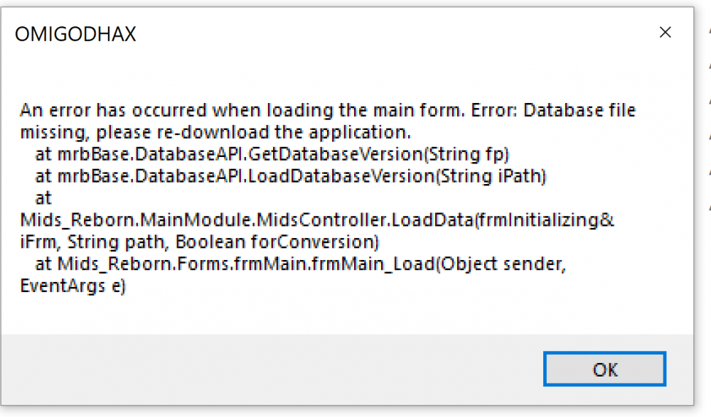 17. I have had the unable to check for updates error since the January patch, but now on a new install to try to fix that, I have a new error that makes Mids completely unable to launch. I downloaded and attempted to install the 3.2.17 release with file 3.2.17.72, database 2022.02.22 on two different computers. One is a brand new laptop and I left the Camel defaults unchanged. On the older desktop, I installed to a D:\Programs\Mids Reborn\ folder. In both cases, I got the same error on launch. The new install to the older computer did not give me any messages about removing or updating the old version. It just installed. Any suggestions?