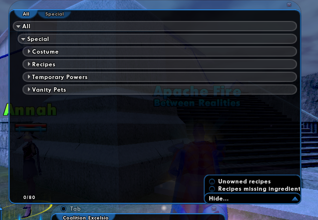 So, there's a remote chance this is user error somehow. I go to Annah, click "Give Annah the salvage. I've got about 50 pieces of each costume in my inventory. There is no option to see "supergroup" items. Is this only available for select SGs or something? Or, only SG leaders? I've tried with multiple characters, and don't see the option. I did check the lower right to ensure both of those options to hide recipes for whatever reason were unchecked.
