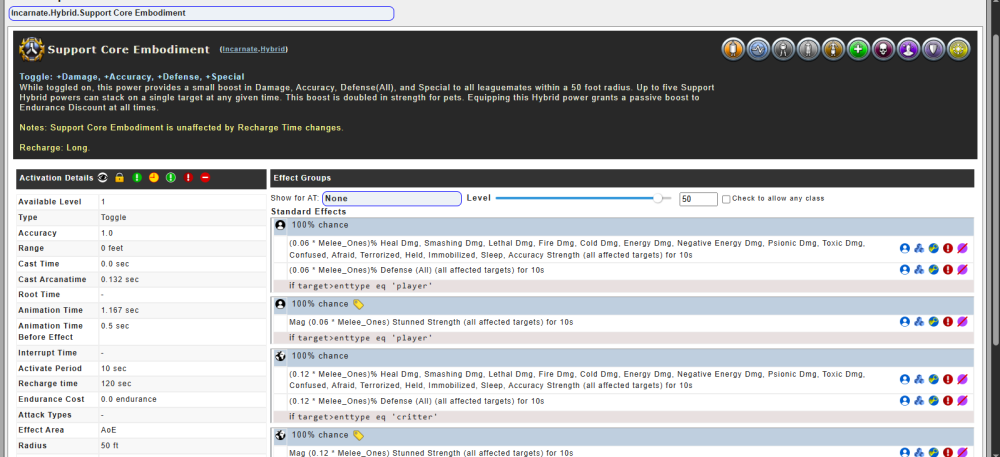 I appreciate the time folks are taking to explain and expand on their thoughts. I should probably share the context of my curiosity. Solo, I'm about getting something done. I don't often do +4/8, as I see no added value to it. More inf? Incarnate XP? That's not a driver for me. I want the merits and/or the reward table. So, in that context, I don't even use hybrid most of the time. I'm thinking mainly about Hamidon raids and MSRs. In both, there's generally a cluster of characters for buffs. Specifically with Hamidon, and the use of incandescence to bring the league together, I see the reliance on lore pets to get things done quickly. Now, that leaves me to explore Support Core, which provides this information: My fire/nature affinity character doesn't dish out anything but fire damage, 12% more of zero is still zero. Now, if suddenly my fire blaze attack which deals 100 fire damage, (as an example) now dealt 112 fire damage, and 12 damage of all the other types, well, that would just be OP and crazy, so that certainly isn't it. So, it's my thinking that this would just boost the fire damage my corruptor does by 12%, for all attacks, and 24% for the pets. (or is it something more convoluted like: Pet Damage = Base *1.12*1.12 No idea if that's right. They say the boost is doubled. My brain says 24%, but CoH math is weird to me. ) But radial is a different thing: Most of you have seen these snips before on your own characters. There's a part when you're figuring out which way to go, where you see the core side gives a stronger boost, but for a reduced area. Oh, and you can scroll all the way down - there's no mention as to how much of a passive boost to Endurance Discount is granted. And given all the end discounts my character's tend to have, finding it in combat attributes is just more trouble than it's worth - if it's even displayed there. So, it leaves me to conclude Support Core is better for the league than Support Radial if we're all snuggled within 50 feet, which seems to be the case during a hami raid. It would be nice to definitively know what "special" means. I sometimes think it means things like slows, and debuffs and such, but there's no evidence in these tabs what that means. And, given that Support Core extends to pets, it begs the question - does it only extend to mine, or the league's pets? It seems like it would, provided there's only 5 total active in the area. I am likely missing something. I hear that support radial is preferred for the hami raid, but I don't know why. The corruptor brings value to these with buffs and scourge; boosting the damage it does via assault doesn't seem like the right path, as it has no impact on pets that I can see. Am I missing something? What am I missing?
