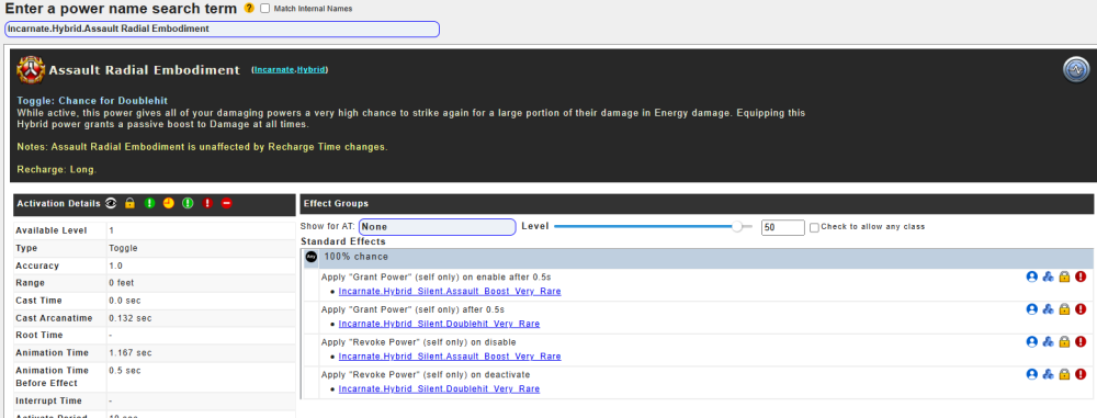 So, as much as the lazy jerk in me would love for someone to just say "Do this", I don't enjoy asking questions like that. I like to find the answers on my own. So, off the top of my head, for my specific question - I think the answer is assault radial hybrid. I'm on a water/natty core. And I want to dish out - not just the most dps for me, but for my lore pets as well. And the team/league, if applicable. So, the first thing I do is read the information for each description of the various hybrids. Some of you know exactly where I'm going with this. Do I seriously have to go to brainstorm to discover what the answer is? So as to not take up a bunch of room, this is what city of data has. And City of Data is appropriately named. All kinds of data, but it's not processed into information yet. How does one process this into useful information to make an informed decision? I'm going to have to go to Brainstorm, and that kind of reeks, because I've got other things I want to do. From what I know, a blaster typically wants Assault Core, unless they're routinely at the damage cap, and then they'll want radial. And since I expect this corruptor to be at that cap frequently, I would be inclined to go radial, but I cannot find any clear information that I'm smart enough to interpret from the data that's there. I don't at all grasp why the word melee is used as a variable, or constant, or whatever it represents. I do see the 100% chance, which is useful, because I know what that means. But 100% chance of what? The description says "a small boost". It would be truly amazing if the word "small" were replaced with a % value, so one could compare that value with the value in hybrid assault. But, we've got what we've got. I'm grateful I get to see this much, but I sure would like to figure out what this all means, without having to consult City of unparsed data.