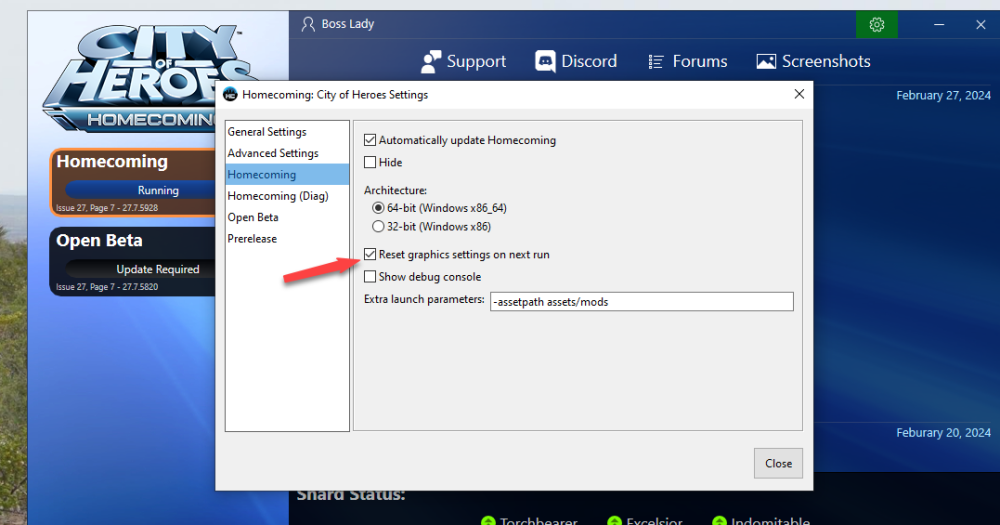 2. I had the same exact issue and was able to fix it by going into the HC launcher and clicking the gear at the top, then selecting "Homecoming" and then checking the box "Reset graphics settings on the next run" I hope this works for you too.