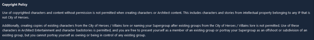It'd be nice to get some more clarification on the policy around homages to CoH/CoV characters (esp. for RP purposes, i've seen and played a lot of characters who were inspired to take up heroism by their idolizing the Surviving Eight or were visually distinct clones/AU versions of signature characters and having spoken to other people who make those kinds of characters in a "hey! same hat!" manner we're all fairly unsure of where the line is that would get us Generic'd) and where exactly the lines get drawn on those vs. the more rigid "obviously, don't make Wolverine" rules around copyrighted characters. There's been a few informal clarifications from GMs in various forum posts and messages in the discord server over the years on where they draw the line on "copies" of in-game characters and their reasoning for it, but it's still something that feels like it's gonna put you at the risk of falling afoul of a GM who draws that line differently to another.