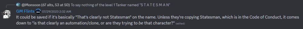 I appreciate the explanation, but I feel like it misses my point that this would be information that would be great to have in more permanent form directly from the GMs/Devs either directly within the Code of Conduct or in an explainer/FAQ thread on the subject of character homage pinned in a visible spot on the forums, rather than nested in several 2+ year old threads and then repeated second- or third-hand by users with no association to the GMs.