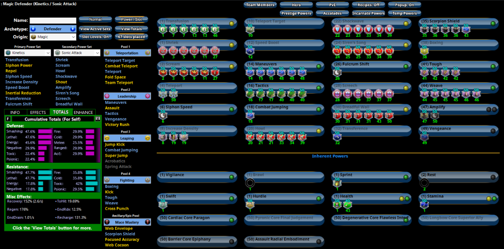 I'm sorry, I'm just seeing this. If you're still interested, this is an updated version of what a 'no budget' Kin/Sonic Defender would like like if I were building it. There are many knowledgeable and experienced folks on these boards who might offer a different perspective, and I've always learned a lot from them so (if any of you are glancing in) I'd love to hear it! Basically on offense, your primary focus is, of course, FS and even without Hasten this build will have it up for you every 20-25 seconds. After that, you either chain together your three cones at groups or chain together your three single target attacks at the hardest target in the room, applying Transfusion & Transference if or as needed. Between fights you refreshen everyone's Speed Boost and Increase Density. In my opinion, Kin/Sonic is one of the best post-50 builds because so many characters have their defenses and Endurance issues already figured out, and the most welcome assistance you can offer at that point is to speed everything up for everybody. 90% of the time that means keep them fighting at the damage cap and stack -Res debuffs on your enemies while staying alive yourself. Teleport gets you across the board in the fastest way possible and Teleport Target is so damned convenient on teams I really miss it when I don't have it. As for Incarnates: Cardiac Core Paragon increases the Range on your cones which can make a huge difference and helps you smooth out your potential Endurance issues. I like the Pyronic Core Final Judgement because of its fast activation speed and superior damage. As an alternative, the Void Radial Final Judgemenbt is a killer follow-up to Dreadful Wail and a very effective area-wide DeBuff when things get hairy. I find Degenerative Core Flawless Interface to be the most effective Interface option. Longbow Core Superior Ally is a powerful, complimentary Lore option, but if you like smaller Lore pets, I'd probably go with Talons of Vengeance Core Superior Ally. I selected the Barrier Core Epiphany Destiny to do my part on teams that like to try and rotate them. For Hybrid, I like the Assault Radial Core because you get more bang for your buck with it and none of the other Hybrids really benefit you all that much. [K-D1VA].mbd A couple of minor edits: I like to slot the Celerity Stealth IO in either my prestige slide and the Quickfoot Run speed/End Redux IO in the other, so I can toggle back and forth depending on whether I'm currently Stealthing it. Also, since I tend to only use Amplify in conjunction with Dreadful Wail, I've moved that Rech Redux IO from there to Fulcrum Shift to get it up a few seconds faster each time.