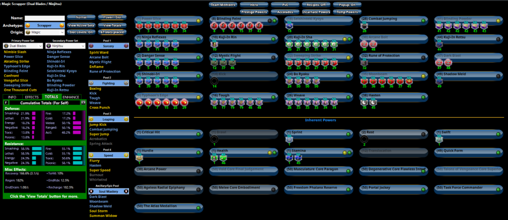 I have had tremendous success with this particular power set combination - it's the most fun, most effective and most versatile character I've played in the game. This is the build, for comparison: [Veil of Blades] Current 2.mbd Keep in mind, all those defenses are the baseline, before you ever use things like Rune of Protection, Kuji-In Retsu, any of your Incarnate abilities or Accolade powers like Eye of the Magus. EDIT: I've updated the build to represent what I'm currently using.