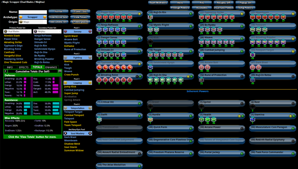 You're not going to beat this for solo play. What you want is 1) the ability to deal substantial damage on your own, 2) defenses high enough to be able to survive on your own and 3) the ability to effectively Stealth any mission you want. Here you go - Dual Blade/Ninjitsu/Dark: [Veil of Blades] Current 2.mbd Keep in mind that the defenses you see listed do not include things like Rune of Protection, Kuji-In Retsu or any of your Incarnate abilities or Accolade powers. Happy Hunting!