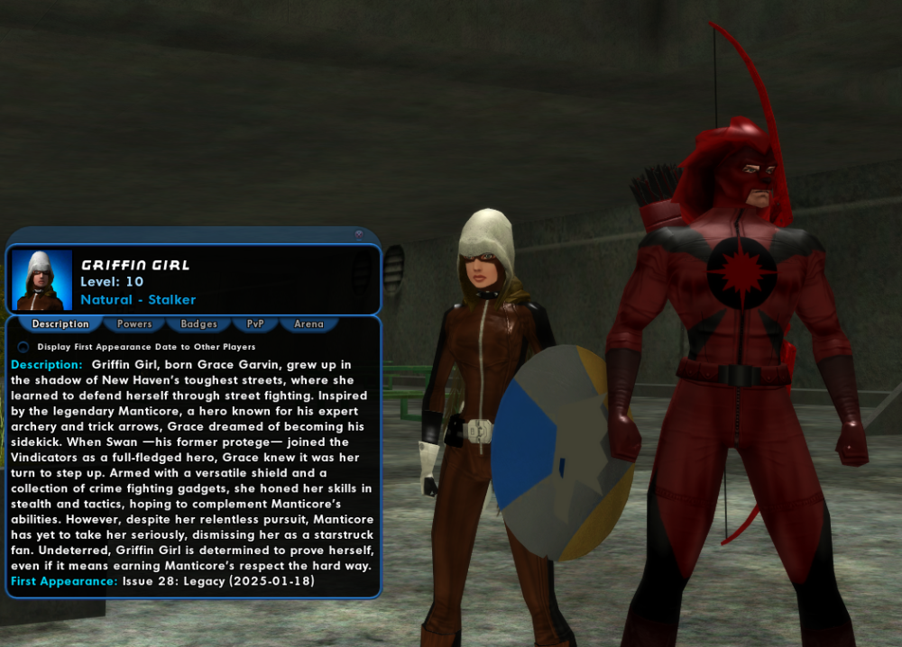 I've seen a couple of young versions of major NPCs like a Tyrant Junior, Kid Nemesis, and so on and thought about creating one of my own. Instead, I made Griffin Girl as a wannabe sidekick for Manticore since Swan seems to have outgrown him. I'm not entirely sold on the hood, but I like the shape of it and the two-tone nature lets me blend it with the feathered cape. I might switch to or make a 2nd costume helmeted version. Initially I was going to make her as an Archery/Martial blaster so she could mirror his bow and arrow theme but also do a little hand-to-hand fighting, but I opted for a Street/Shield stalker because I wanted to put the eagle emblem somewhere other than her chest.