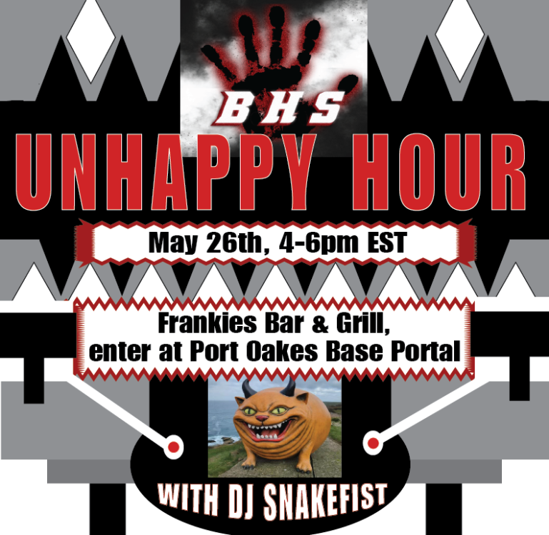 The Black Hand Society is hosting the 3rd Annual Unhappy Hour! After a week of running heists and outwitting capes, come cool your heels with the Black Hand Society, network among colleagues in crime, and plotting crimes over drinks and music by DJ Snakefist!