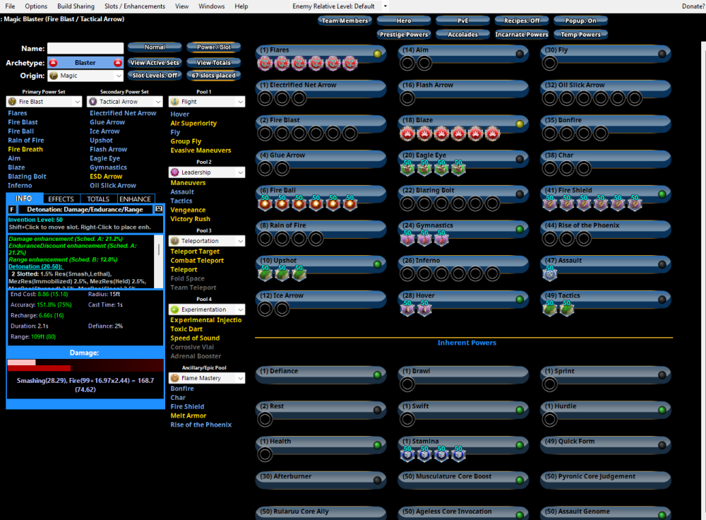 1. 1. Goals= Team player: master of dropping DA' BOMB on mobs, True Shooter style Blaster (like the name implies} I want to Blast Stuff! Soloing AV's is NOT my goal but being able to maybe die once or twice before melting them solo would be ok. Less Sheilds because friends should be sharing theirs and MORE POWER (Tim the Tool Man Taylor's grunt). 2. Identifying synergies= I really like the Oil Slick and fire rain combo along with the Net arrow and ice arrows (for trapping in said fire rings); bone fire is a must (with knockdown enhancement) to also help (control mobs) {I know I'm not a controller, but I know I'm a glass cannon safety from a distance is important}. Fb BB and Fire Ball are my main attacks, and I wouldn't trade any of them for anything. Infernos damage is amazing, but it puts me directly into combat something a true ranged induvial should avoid. As for Leadership and the other power pools I don't really know what synergizes with MY build, so I was reading what they said they did and tried to pick the best. I figured better aim and defense were a must, so I took Leadership, and my toon has wings ofc I'm taking fly/hover. 3. Identifying gaps= Endo was my major gap at first but after spending a little influ I made it so that wasn't a problem. But since then, I've only be criticized about my build, and I never really saw anything wrong w/ it. Even now I'm wandering does making up for Defense take away from that issue of Endo I already solved. 4 Mids plan= Oh boy where to begin.......so if you are struggling to get everything mids is a BAD SUGGESTION. It's like only knowing English, but reading building instructions written in Chinese and spoken in French. I can slot and do everything in there but it doesn't really show me anything if I don't have 100 Kazillion Infu. I know what a fully loaded Toon CAN be but I'm a broke hoe with not a lot of extra spending cash. Below is as far as I made it before looking up prices and just about crying.