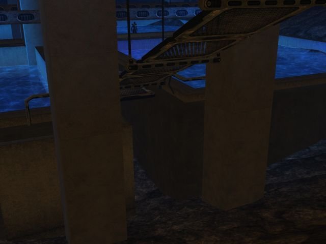 A while back I discovered that there's actually a fourth level in the 'pool room' — from the entrance, go to the left side ramp to the lower level; when you go down the ramp into the main area, angle to your left, and you'll drop off the ramp, where you will be able to get under the ramp you were just on, where there is a '+' shaped area between the lower pools and under the walkways of that level. I found out about it when there was a lieutenant stuck down there as the last mob of a defeat all mission. Update: I happened to get the pool room on a Council map just now, and was able to screenshot the entrance to the real bottom level: And even more entertainingly, although it wasn't a 'defeat all' mission, I found a Council mob there, in this bottom area under the lower pool level: