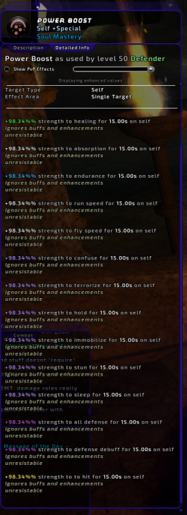 Not sure if this is a typo, or a possible bug/oversight, but every iteration of Power Boost states that Knockback effects will be enhanced: However, detailed info says otherwise: Also backed by City of Data: Can we remove the description stating Knockbacks are enhanced? Or better yet, if they ARE supposed to be enhanced, can we fix all occurrences of Power Boost to actually enhance Knockback and Knockdown effects?