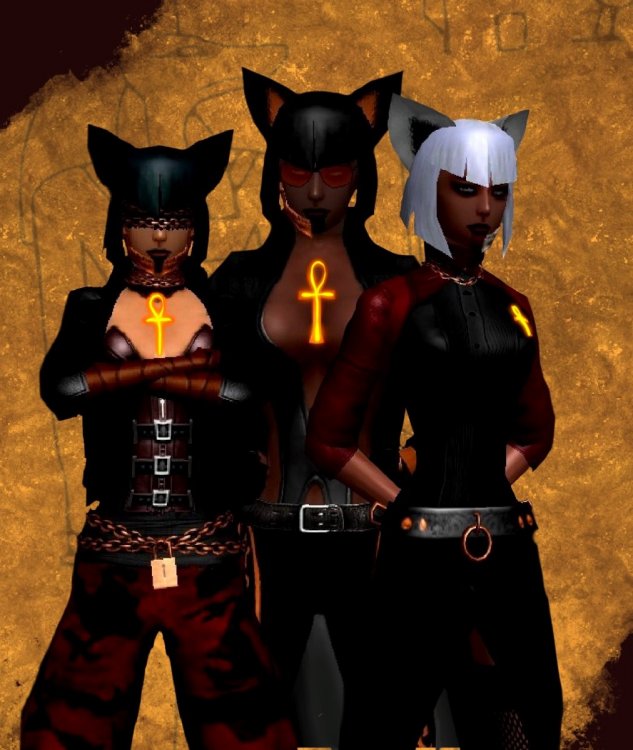 ----[ Part Three: The cat is out of the bag } ---- Before her now, where once there was just this small little blindfolded menace, now there stood three. Each of them were covered in strange gold and glyph saturated outfits, but she could see each were different. The silence of the room, formerly filled with just the beats of rain from outside, was now overtaken with what she assumed was.. bickering? The three of them, no sooner than they had appeared, seemed to already be at each other's throats with the strange words they had spoken before. It sounded familiar, but the speed with which they spoke it left little room for her to process it with all that was going on. For as boisterous as they were, it offered her the first moment to really get a true chance to look at them while they seemed so indifferent to her presence. Cats. They were clearly cats, weren't they? Tails, Fluffy ears... But other than that they seemed normal, human even. She had to stop herself as the thought crossed her mind. There was literally, absolutely nothing normal about this in any way, shape, or form. What was supposed to be a simple evening, taking care of a few things in her domain, was now shattered as completely as the jars. She stole a glance down at the smashed pottery on the ground below, but it felt so trivial now, as she looked back to the arguing cats, who seemed to be pointing at eachother as much as random things in the room. Priorities. Right, what are these things? She took a moment to look at the three, her analyst hat tightly on in a metaphorical sense. The one she had spoken to first, the short one, caught her gaze. She seemed to be the most wild in her chatter. It was so odd to see that her face was still covered in that strange blindfold that seemed to do little to impede her ability to recognize what was around her as she faced her other cats with no troubles or seemed to almost glance at things that were pointed out. She seemed paler than the other two as well, not that she was pale by any means. Amanda reckoned her own pale skin would burn red long before she could even get close to stealing a tan like that from the sun. It was only now she seemed to notice, her hair, her ears, and tail... it wasn't black, well not entirely. As her eyes adjusted to the light of the room, now that the sudden flashes had ceased, she could tell there was a faint blue to her hair. Or would you call it fur? It looked like hair... it moved like hair. Would it be rude to ask, she pondered for a moment, but realized now might not be the best time to ask, as she saw the little cat leaning over and thrusting an accusatory finger into the chest of the tallest one. She could tell their clothing was, well, it seemed vaguely Egyptian, but nothing like she had seen even in artistic interpretations or glyphs. Also... were those bones? She looked between them, and on each of their jaws they seemed to be wearing what looked like a jawbone, but they were made of gold. Morbid jewelry, she thought. Her eyes followed the accusing hand towards the tallest of the feline invaders, where as her eyes traced their way up to her face, she was somewhat dumbfounded. Where what she had expected to be frustration on her face, noting the tone they were passing between them with what she assumed were barb-laced words, she instead found a face fighting desperately to keep from smiling, as though she wasn't taking whatever was being said seriously. In fact, her entire body language seemed to confirm this as the tall one had her hands resting on her hips. She seemed rather relaxed, as if ready to dismiss whatever was being thrown her way. Amanda took a moment to pull her eyes from her, to try to get a better sense of what she was looking at. The tall one's hair was very dark, as black as she had assumed the first was wrongly, and her skin was much darker than the others... her eyes slowly looked down her figure and paused as she looked at her chest. It was... glowing? Amanda blinked for a moment as if to confirm her eyes were indeed working. An, Ankh? She almost blurted out but managed to keep her thoughts trapped behind her lips as she was dumbfounded. As if reflexively, she glanced to the others, there it was too! On each of them, in the center of their chests was a glowing rune. What did that mean again? She was sure she read about it a thousand times, but her mind being so distracted, found it impossible to draw upon her years of study. As she looked to the last cat's rune, she couldn't help but study the rest of her too. Her skin, not quite as dark as the tallest, but not quite as pale as the tiny one... she seemed different, her tail was white, and her hair. Even her... jawbone was it? That was a silvered metal as well, rather than the gold the others wore. Was she different? She pondered this for a moment, as her eyes darted around this strange creature, until in a moment she felt a chill go down her spine as her eyes locked with the white cat. She... was looking right back at Amanda. -