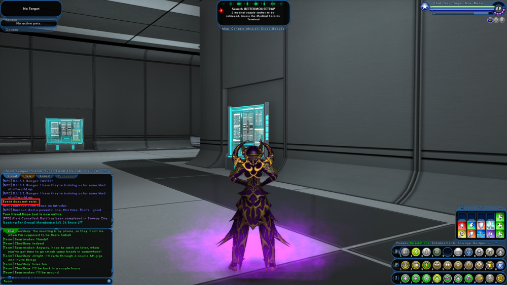 These 'Event does not exist' messages appear related to the Arena, but do not seem associated with any channel that can be added or removed. I first began receiving them when sparring in the arena for a bit with a friend. They appeared frequently while creating events and being invited to them. At the time, I largely ignored it as a minor issue. However, those messages CONTINUED to roll in regularly after I left the arena behind and started fighting in another zone. One will appear every time I zone, and sometimes just from moving around the map. Even after rebooting the game completely, turning the entire PC off and on again, the messages are persisting. At this point, they seem to have just attached themselves permanently to the character, which is... troublesome. Some solution would be appreciated, even if it's just a work-around for silencing the messages for now...