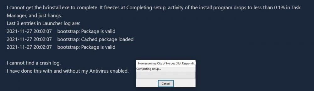 I am having a problem with the new installer. It runs, it makes the new directory separate from Tequila, but it does not seem to finish, or end. I do not have any new Icons on my menu or on my desktop. Task manager shows HC Launcher (32 bit) as running 0.1% processor occasionally, 4.6 MB memory, no disk or network usage. What gives? I have shut it down, restarted, Deleted new directories and run it again. Same result.
