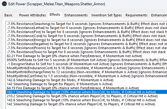 5. You mean this? (Normal) (With "Critical Hit" toggled on) Looks like a Mids bug It shouldn't be going from 182.7 --> 508 Base damage. In reality Rend Crits add 142.6 base damage (Fast) or 182.7 base damage (slow). But Mids is applying BOTH the 182.7 AND the 142.6 regardless of whether the attack is "fast" or "slow". See those last four effect entries? Those are what Mids is using when it calculates Critical hit damage for this attack. The two that mention "BossCrit" are both being added simultaneously because they lack conditional modifiers to tell Mids that they should just be used in Fast/Slow mode. If you're in Fast mode, subtract about 182.7*(whatever your attack's damage buff is) from the stated Crit numbers and you'll get a more accurate picture. (in my build that's 100%+119.11%+9%=228.11%... which results in 1363.2-416.75697=946.44 expected crit damage; when procbombed. Which seems much more like it!)