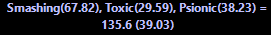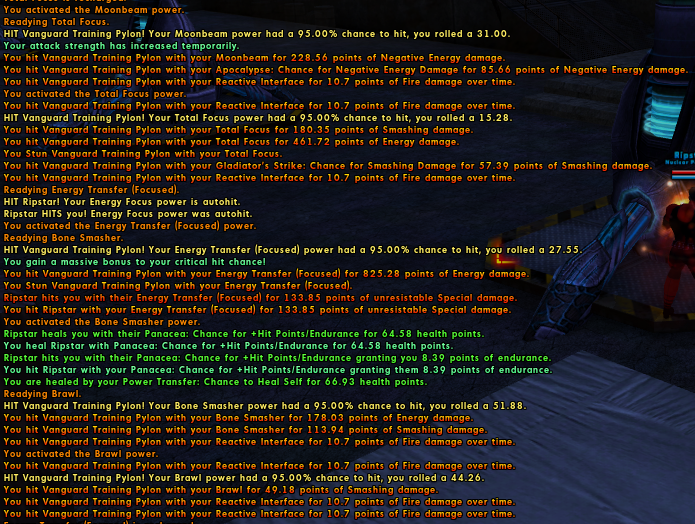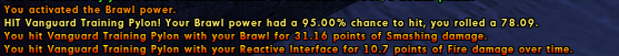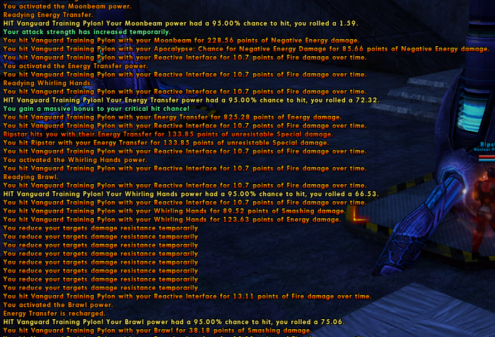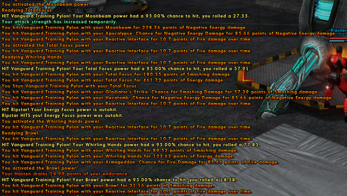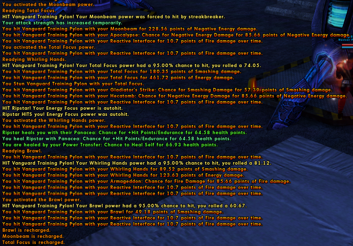 4. Update: @Bopper has drawn my attention to a potential discrepancy. The effects of the Gaussian Proc appears to kick in on an attack regardless of whether or not that attack's ATBE falls within the buff window. Whilst this is contrary to how I understand regular power effects work... there's evidence to indicate that this buff is getting "snapshotted" at the point whenever an attack first activates. Which allows you to fit in a "longer" attack than you might otherwise expect at the very end of your buffed-up attack chain. As a functional example... Picture an initial attack chain like Fast Moonbeam (with Gaussian) -> Total Focus -> Energy Transfer (Fast) -> Bonesmasher Fast Moonbeam has an Arcanatime of 1.584 and an ATBE of 0.933; meaning it should subtract 0.651s from whatever the Gaussian buff window is. The Arcanatime of TF + ET(Fast) + BS subtracts a further 5.342s; for 5.993s total. If we round up the ATBE of Fast Moonbeam this becomes 6.116s; which leaves a mere 6.250-6.116=0.134s for the next attack (assuming that the buff window is 6.250s!) Naturally, there aren't many attacks that have an ATBE of less than 0.134s... but in-game testing shows that a follow up attack with a ATBE of 0.5s still gets the benefit of the buff. Note Brawl is reaching 49.18 damage - meaning it's getting the effect of the buff. It's normally ~31 damage. The same holds true for the chain Fast Moonbeam (with Gaussian) -> Total Focus -> Whirling Hands Fast Moonbeam has an Arcanatime of 1.584 and an ATBE of 0.933; meaning it should subtract 0.651s from the buff window. The Arcanatime of TF + WH subtracts a further 5.412s; for 6.063s total. If we round up the ATBE of Fast Moonbeam this becomes 6.186s; which leaves a mere 6.250-6.116=0.064s for the next attack (assuming that the buff window is 6.250s!) This is where things get funny, because SOMETIMES a follow up attack gains the benefit of the buff, and sometimes it doesn't. Note that Brawl deals ~49 damage in the first screenshot and ~31 damage in the second; despite the fact that I was queueing up each power before the previous power finishes animating. (A margin of error of only 0.064s could easily be gobbled up by lag in animation activations/arcanatime/server ticks/etc...) Brawl has an ATBE of 0.5... however attempting various different "last attacks" with ATBEs ranging from 0.5s-1.167s here showed that it was possible for each of those attacks to actually gain the benefit of the buff; regardless of what its ATBE was; as long as the attack STARTED within the buff window. In fact it seems to take pushing beyond 6.250s to actually always fail to work. Fast Moonbeam (with Gaussian) -> Energy Transfer (Slow) -> Whirling Hands Fast Moonbeam has an Arcanatime of 1.584 and an ATBE of 0.933; meaning it should subtract 0.651s from the buff window. The Arcanatime of TF + ET(Fast) + BS subtracts a further 5.544s; for 6.195s total. If we round up the ATBE of Fast Moonbeam this becomes 6.318s; which is over the 6.250 buff window threshold. This time I can't get Brawl to get the buff despite multiple attempts. So it looks like it's always falling outside the buff window; so this third attack chain is simply too long to let any subsequent attacks gain the buff. TL;DR: All this seems to indicate the following: + The Gaussian buff window starts kicking in on [the ATBE of the attack that the proc is slotted in, rounded up for Arcanatime] and it lasts for 6.25s + The ATBE of the last attack doesn't seem to actually matter; what matters is starting that last attack within the remaining buff window. + The buff actually kicking in on an attack seems to become less reliable in/around the ~6.20s mark. This is likely due to lag/rounding. e.g. 6.116s elapsed = OK. 6.186s elapsed = OK (although sometimes fails to work) 6.318s elapsed = NOPE; can't get it to work. So if you are always starting that last attack within about 6.1s; then you should be good. And given the mechanical similarities... I imagine this all translates to the Scrapper ATO2 proc; just with a buff window of 4.25s instead of 6.25s. (So if you are always starting that last attack within about ~4.1s then you should be good). In practice this means there is likely even more wiggle room than we previously thought in the buff window(s).