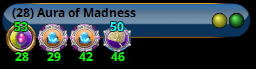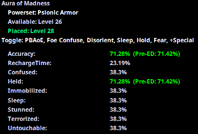 18. Aura of Madness/Insanity gets boosted and resisted by Magnitude, not by Duration. It has 0.5 Mag (unboostable) plus 2.0 Mag (boostable). You need it to be >Mag 3 to affect bosses, >Mag 2 to affect LTs and >Mag 1 to affect Minions. 2x Level 53 Acc/Mez HOs (+75.93% enhancement) will increase it to (0.5+(2.0*1.7593)) = Mag 4.0186 against even-level foes. 1x Level 53 Acc/Mez HOs (+38.30% enhancement) will increase it to (0.5+(2.0*1.3830)) = Mag 3.2660 against even-level foes. Therefore a Single Level 53 Acc/Mez HO will get it to the point where it starts affecting Bosses; assuming you're only fighting even-level foes. However typically at endgame, you will be fighting at +4x8 against Level 54 foes as a Level 50+1 character (so they'll be +3 to you!) 3x Level 53 Acc/Mez HOs (+97.23% enhancement) will increase it to (0.5+(2.0*1.9723))*0.65 = Mag 2.88899 against +3 foes. 2x Level 53 Acc/Mez HOs (+75.93% enhancement) will increase it to (0.5+(2.0*1.7593))*0.65 = Mag 2.61209 against +3 foes. 1x Level 53 Acc/Mez HOs (+38.30% enhancement) will increase it to (0.5+(2.0*1.3830))*0.65 = Mag 2.12290 against +3 foes. So without an Alpha Slot or set bonuses helping you out, you can never get it to the point where it'll be kicking in against +3 Bosses. Technically a T4 Intuition Radial Alpha Slot plus 3x Level 53 Acc/Mez HOs (+120.88% enhancement) will get it to (0.5+(2.0*2.2088))*0.65 = Mag 3.19644 against +3 foes. ...but that's only for HOLD aspect; not Confuse/Stun/Sleep/Fear. So "best case" you could get it to the point where it's able to occasionally hold +3 bosses. TL;DR - without set bonus/alpha slot assistance; the breakpoints are: Default Base Slotting: Will let you mez LTs at up to +1; and Minions at up to +4. 1x Acc/Mez HOs: Will let you mez Bosses at up to +0, LTs at up to +3; and Minions at up to +4. 2x Acc/Mez HOs: Will let you mez Bosses at up to +1, LTs at up to +3; and Minions at up to +5. 3x Acc/Mez HOs: Will let you mez Bosses at up to +2, LTs at up to +4; and Minions at up to +5. - - - - - - - - - - - - - - - - - - - - - - - - - - - - - - - - - - - - - - - - - - - - - - - - - - "WTF Mael; just tell me how to slot the bloody thing!": For Mez purposes, you should really just stick a single Lv53 Acc/Mez HO in it and call it done. But it has poor base accuracy (80%) so unless you have a sizable chunk of global accuracy... I'd go with: And be aware that Mids' still thinks it's got 1.0 base accuracy instead of 0.8! In reality with the above slotting, my Stalker with 54% Global Accuracy is JUST capping their hit rate vs +3 foes.