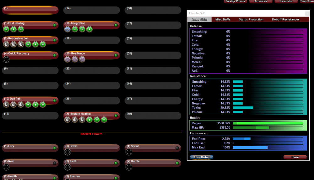 Ok. Show your work. Here's mine. Regen at its best, everything running, SOs, no pools. SR at its best, everything running, SOs, no pools. Regen's extra HP is awesome. Too bad it's going to be hit by EVERYTHING. Edit: And the pics still don't show SR's scaling resists. LOL.