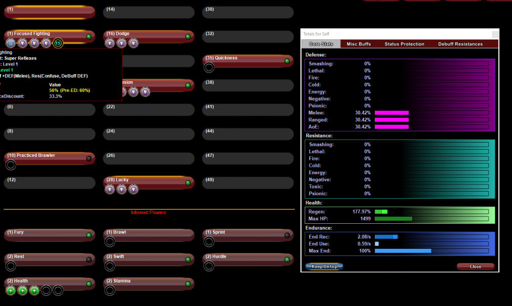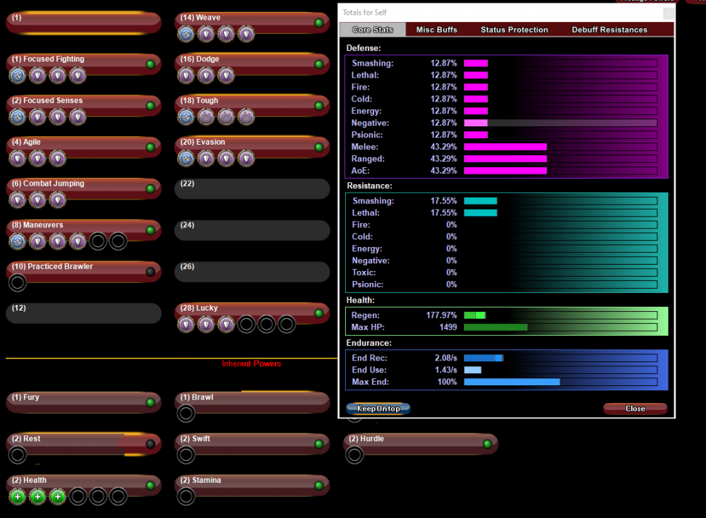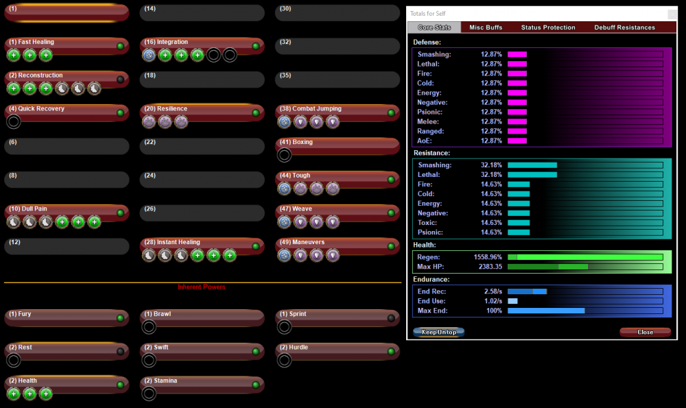 43.29% with cj, manuevers and weave. Plus scaling resists. It'll stomp regen with SOs without even breaking a sweat. Not to mention throwing tough and 3 SOs into health into the mix. Of course there's also body mastery for even more regen backed by near softcapped defense to ALL positions. Yea, this is brute/scrapper values. Cuz we can't get regen on tanks. Cuz it'd still suck.