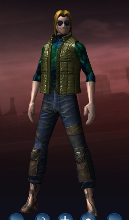 I wanted to make him a dirtier hippie. I gave him the Quilted Sleeveless Jacket over the t-shirt which lets it stay psychedelic while deflecting attention from how it's not "real" tye dye; changed his spotless, almost white jeans into crummy Post-Apocalyptic style pants; and swapped his brand new Sneakers for Bare Feet with a brown Camo pattern. (You could try Camo on his hands too, maybe not quite so dark.) He's absolutely filthy. If it were me I would make this guy Plants/Poison. At first I thought, "I don't want him to actually spit poison out of his mouth," but then I thought, "Why not? Maybe in 'reality' he's just throwing it at you, but if you're fighting this guy you're already in a cloud of hallucinogens so it's fine if it looks a little different from what is 'really' happening." I didn't think about it until after I took the screenshot but maybe his aura could be one of the 'smoky' or 'smoldering' types to give a more blurry out-of-focus effect. But the glowing aura works too. Consider making his power effects all sorts of different weird colors. They don't have to match any part of his costume.