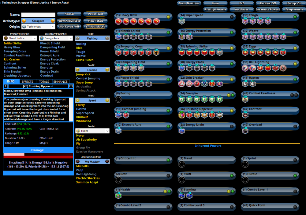 I'm starting a Street Justice / Energy Aura scrapper that will focus on maximum recharge (and no, he is NOT "the fastest man alive.") It would also be nice to work in some KD and Stun procs as damage mitigation and for looking cool when I kick them in the face with Shin Kicker. I plan on getting him equipped with enhancement sets as I level, starting at level 30 in order to spread out the cost. Has anyone built a superspeed scrapper with these powersets or have any advice on how to do so?