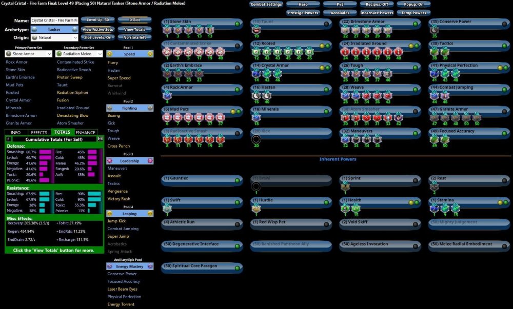 9. It's nice to see at least a little confirmation on what I arrived at in regards to Atom Smasher on my tanker. I've been very happy with how it performs even if my Brutish (sic) counterparts are a bit faster 🙂 I'm just a tanker at heart. One thing I do that I don't see when I join FF teams is the KD in Mud Pots. I find it helpful in teams with a mix up "helpers". I give just that little bit of time for them to heal through spikes, unwanted aggro or general spats of over confidence. I taunt often too, for the same reasons. When I solo I run two identical tankers. I've been raising a Kin to see if my old bottom can run three at once but really, I likely won't ever do that 😄 If anyone is at all interested: Crystal Cristal - Fire Farmer Final - Tanker (Stone Armor - Radiation Melee).mbd