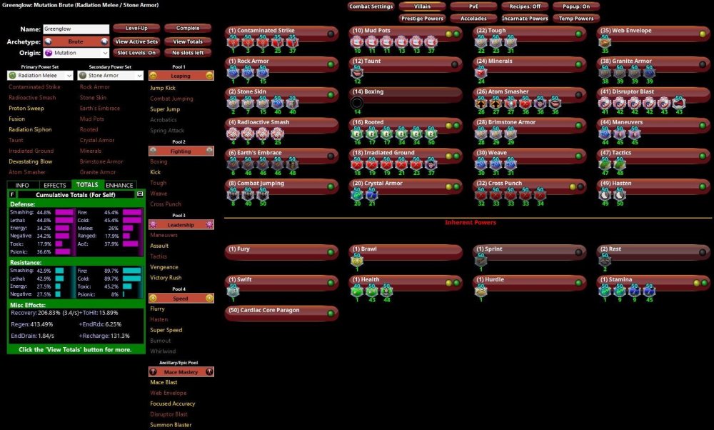 3. I'll plop my Brute here, although I prefer my Tanker variant these days. A few things to note: NOT budget, but not stratospheric either. Meant to be played active, but functions well as an AFK. I used it as my 2nd in my personal FF runs until I switched to two tankers. Granite is an "OH SNAPPLE!" button, if needed. I've never used it. Greenglow - Brute (Radiation Melee - Stone Armor).mbd |MBD;23445;1495;1996;BASE64;| |G5RbACwKbBuZfSeOBuYtPTK/LkW69ky3UPnpuU2Y3vUK5OFDKB+SGb1m0enqq8uFykd| |3PUgCFKWn5Psz91TVbqg3NuUVzaYnOPNU7hAMMN7/vrXXF/eVitGxuOdywsbILMyFoQ| |gOYUJYRPlfFaAwBMLUmXqUdlbtjLqca2Vdz1X+ehdZ2ZqMaddB9zgtRIIh2v73zrDIG| |BW9mvrY81AYOutjoRnXEFB+B4XPnZu+AtghjVBoFNcS8H3oicYX5wf2zXjEoeOFUfgu| |gCZV1OWjGbkaBK6UDJfe1TFjFYH52YYb3nNrYdii99jk1xsMofY9LX4SSJGyVa83osk| |RX+ii/t7iQB4wYLM1c7f1k0fA2EVaa7Cj2PKOJK+2Z9jWIU+jupus+RgOyAgrWdqfbW| |Jf0KNj47BZBtj/0pG/adClmuoWimYNPsSaaN32ja5ZJ9wUHZtD/vfd6tKYnJ36A9TG9| |80jW9q/VS+Vvm5nZoybE4M367vv1cXR/ELC+8uiy9TMrq+Ua2c7EjwM08cEBlq9VDuJ| |iHZ+wNzntfPz6IwLIylHM4xUDMmzx85GYKL3VAp3OAhavPZW72HGBzcfB71wAjs6eMe| |P/A9h+jyY72yE3eB/XKOShACXwAVmhU/2UkfrYMa9S7NTTpGMeDVhCy1bYrEwQdHVst| |mWuqtTJQscDU9sjQmyyR2tdP4XuMi9G1IuBDC0uQgpyAoKgkCEdteN5TWa8CUUM9cMp| |1YUdkQFQ6SFLRdHuh1Jiz7vndmQqQnNYF1u4lEiPMqDied3cYWehvktt9Q152vBoMhJ| |BaN/PmzdyzEZptVI9ZMZNmVFKMVdYoALEQyDGN6xtjWbnlise08ZWmjldu9LJXEucQv| |D3sdLZwybX4jLkkyVJ9+sZQVkFdgEFL/eYl3QVZGVTMll7keXoLVvCrOpLek28GZ8X+| |d7qtvuSigvhU0+YiYfTmLw5SJEWB7RRJ841uQZXYUqjCOcrMhLlAZ7xcTHhQnQjj6FB| |dgQ0UtYBxchfo2CIKFhF29Z3mKOL3sgLTEDDCflN8o/9RN5nuSHmr0c8Suzs4zTCtH5| |pAM0Wwif/SJujcZsA4z7sMQdYFhIpsgpceRBZ5KCHN7SAlyIFMgQ1uExxWD8iV86niM| |t81bD2A34Cws+xg+K399RDs0YI4od+Wpdi5O+rGUFuBCxM9kIkUtB0LQssR7HTL9D40| |4tR7gkfheFwIAm3S24nzzjCEscwb5BB7tsyzKOBIhtZlvZ0R15Dad4xzqvmMCY8J9tR| |uZRIVYlfZEFg3WeWfGUsaHYfyCX1o1mGWMY96DOCmMWOgZsu9SojtlbY+VvY53GfmaE| |pEIQw1wyoF0jY2RjUtgRpbFEk7Xzj5E3JdoEimxJdD+KkHrXbVjOEVbqC/ReVke8RTx| |c0vnvegfyYvkqkLEKI/8MUAZavMmrj9a1ezHP5UOJLIhuH7JMFctL45f8ylpWgo0Qta| |nJiQlVmN11O9hZPjktnu4e44LiKt8pz0+lLu+M7z2XFNdeFERYOPtvK58QkegwJZDZo| |SLI9nCtXE9Zza0m1ZWXGGc4WRn2iow/8Kaic0iFyVxeQF6CjSMIQR4B59/usuaE81Cs| |qC3H9IYCP9ckFnaMDTX2RF1exdW/UEkWPoSmmnmVNfkoDONuVZHxQPHstPl91RU3Kkj| |fkfrZoT75jzZHRQj7p3e4Y5VqeFRgvFC8fQvezaayXZaMaau+6QuDTzJ0x//ok23ndi| |WvkfLTXOkkw9T0QjstzUtOMNZxtNfJ0m1Nt3sTWQExj0UAO0jRm31EqAzTv5kF1Zdyg| |f9Uz3c2b6QeTzlBwX9ec17nTz1aPv0I1vK26cavzdfhIQxNGVY3grvU1f/a7nWrSzHD| |XzEUfMCXwuM+xWVAuE5zbM3pldMA6wDCBym/LV2n+nc7viU7F4Oca3d/8ndOSIGWuao| |KoFTF8JdxHi/9HzEkXRrbHwzmG1FyqgxmJHhKyhlOlFeCaknPDg==|