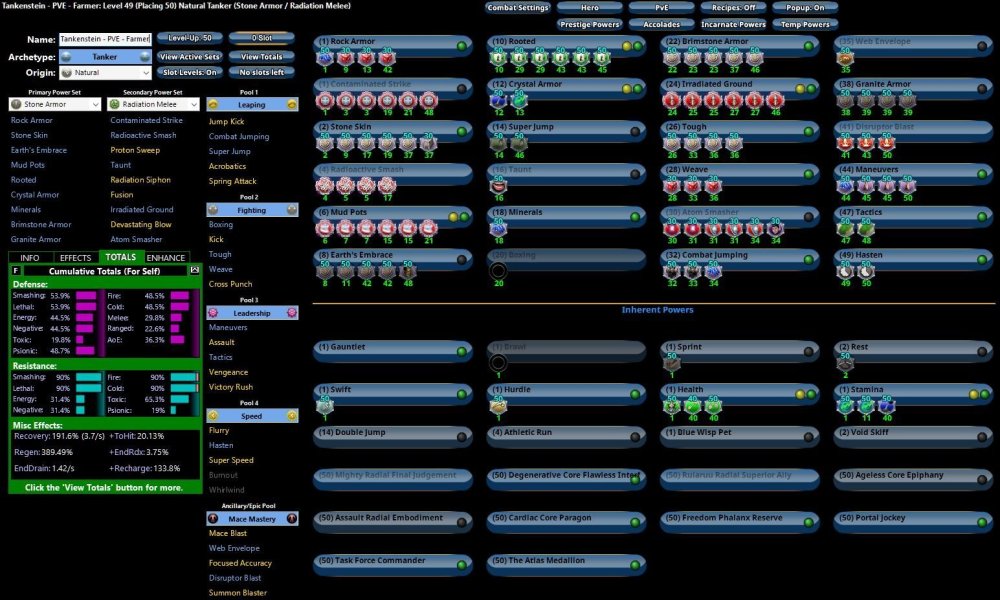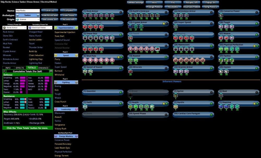 1. I've finally circled back to Granite as a main source of protection while playing. Then I went a step further and thought, the main reason for Granite at all is because it gives so much, why not take "so much" and turn it into Gucci levels of "much'. Sure, why not. Obviously NOT a solo build. The damage ( if you can politely call it that ) is not sufficient for the task imo. I mean you COULD safely do it ... given a few lifetimes and Zen levels of patience. Skip Rocks - Tanker (Stone Armor - Electrical Melee - Energy).mbd |MBD;24144;1484;1980;BASE64;| |G09eQCwKbBuZfSeOBuYtPTK/HiHJbIp07Zm6mPJoHAjTu17347NP046QvNE0i05XX2f| |MVB7d9RIgn9Izdm6+uj5DtIr4EFhAKm5547czvkvskT/t3/9v7dXGq1n3V9gYm52ZFy| |BsWRHPxwmQI1VgUmhcjW89S5cZtfclrHoiZFyrmnpX2UiY7H87A+2/qJHCOPas2tGKI| |krR60d/dt8jLJV8KfiwfYDA7xnh9c6bfgX4FiJqgkdUEJjXGHeLLHEW9c6xxOFLiNg5| |vA+QtutGp0qICLcdMcCSUvsIMdI6gHzWs2H1lDshfEDOqwnaqIhGVZIPWe/7Zq2PJ5L| |IIW+oHH09fDm9eUhJ9tpKFtsX+uprLCzgoJ2pi+qGh5vk62BsyfRKV0huFp0ldhZtDW| |LWIQN06zwMN5WRCaatX2NA95LybhjRomszYgVlX6R9nKFXUniLwnr3fHRx/bMldAa9o| |AyflxLZTdrte33xmHYhYPW2vJJmJtfTdT+EbAluZEptCtAw84EKd9oGmIqtrX9flXTw| |wYKfBaGCUHhUG8gGjGDBCJcbBkx/8I2+B4tPX3gE9A4bQKPTT/mJfxBL7xvy1FFZN+6| |PsDYdDBCgYIgAC8URogZFCNER70DJ1knFV+ZFbflh4/IWEoI/Vhm2iv2il5/5qYbSSf| |T94NouIRljK3n5BFCIiWU5wW4/02VcY4jY7MYSl9lNMHfsS7GEmPx+25nSem2WPEMRQ| |tTwFjPVMqM8iZMyJ9i7tQssTeN+1LjPPAHDsfrwMQe/+6Rsm9cK1+DT4LMwh1O4x2qh| |9MoVbkNQ08DO/yOyqjYI2TsvtnnpG8Z+ZOYVQCEmPs+hOMLmOKaJsDtzTiGRXq2r9Ll| |Rh4wcsGsUcbiLXNfcDsBCptrpm3+c/wW6cV9fUcwtDbXgAuBC41mO3753kvYjeEJbhR| |wK91EO94qxWJTLI73nUEN6rEtkFEfYahQgbAcMEXSzKvARJZyelFDq7kRkulGmM3kGp| |WQcZPkglC4JZsogqSBLIh5LzqkF9kzX0rmb2yodZ6sY+il/0YcA/NeDWXSrnUGcd91P| |ENQV+r9ChNthbU0vUHiRNAZE1VEZEC7VkWI5/uAfgCHieHBby2B/5lD3i+C7XrcIjAx| |9+aTqdW65F/QOwOlGO92vKNl4glUNgv36q7caJ9HtnRcSdUQ+7KAnSJuyIo7MnWje8l| |NzoyqzWAzhcxC68xLziEwI5uOd+0a8a29FTpyECaYk5lQQHPZV1vKroJavxKV0zky4y| |IZgq8nd1iTZ9lyOxG4A+k6trwn/VDvDFLgpUaPYzmkCok+dR91Kq0PKcRD661szMxnw| |gsmlHYbJ86W0KI4QK1iRSk4ad76HqZ1ULstlq0CCFKRwSLKhfToUHo20WLFlOfYpNLM| |AswSMI3jBCMEfH9GGv+ERbForYI1k4FS7FdQEv0baAcADjq/Drg60NtIwcDXmR1/jNt| |Xw+VzWh/44uTpf9R1N+XO393kFKPAWCXPPixSJNt8P/I7l68SEONX8DtTRSdBgCOMQK| |6rxXElCP5/CUqE6016yaMJCREuZrG6pFtiYAR2BLjHo41Bi8xVITRTDMRWPb3ltqZWn| |+n1EmRkOeCB4tpr86zyp3pZQ1LLEsSGw9oVmlghE9jsszzs4Cy8VwAesa984UHg53xQ| |jaSuPk2TTxX9WqchrFj29Lg9uq4WyZJOtrKVtV86X8ZM6wT+1xEJofRXM9g/HFLKWTl| |OJcr1cl60Q0XeVH/qfxbxW94c+yyDUalBtYaneP5q3XTlsoD4efQdtzexOFNdH89yOp| |cFzQePsOiGWiLswwti0pJ5r7+pvp0umVZr4s12p7RcDa3WHLCCayrYPitTf6S7eauzS| |j49EMTB7Qzr5PN3XiivDyFOAnwaJ72RKb79kkM9gV/wVNn2zsxcQ+raXHSCw+zu2XzJ| |tchgXjl+65geQQ5Qn0QOUHHz2wyzDCmVDzQ4=|