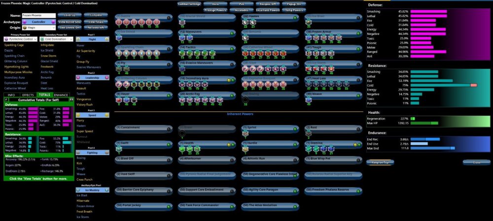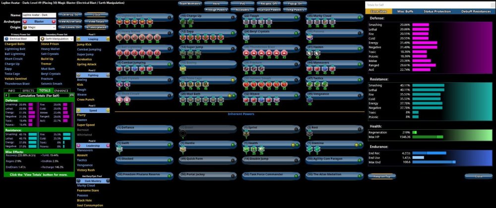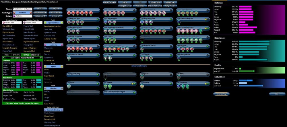 8. I threw together a quick build. This is 100% a W.I.P. but we have to start somewhere, yeah? My initial thoughts going in. I needed a damage type other than Psi as it's resisted a bunch. I wanted a way to move about the battlefield quickly and efficiently. I wanted to take the cookie cutter and break it. I mean, just snap it, melt it down and stomp on it. Experimentation has entered the chat. . . Electricity Master sees an open door and enters the chat. I've made 12 in a short time, so far, Toxic dart has made me wonder why I've never used it. It's fast, it's dot takes a little getting acclimated to, but it works really well with T.K. blast. HIt 'em with the dart, knock 'em back, hit 'em with mutagen ( a toxic dot, yay! ) and move to the next mob, which I can put to sleep with Will Domination. By that time the first two powers are off cool-down. It's been a lot of fun. Kinda like a Beefy controller. I can't wait until my AOE's come online. Jaunting in, Psychic Wail and jaunting out is going to make me smile. A lot. Electric Mastery will lock down groups so they stay in the AOE goodness. It also gives me a good heal, which furthers my path towards a Battle 'Troller. The questions I have nagging me? Endurance. I'm not certain how that will play out. On the plus side, I can turn off toggles as needed. On the negative side, those toggles are kinda there for a reason. We'll see. EDIT: I changed the heal proc in lightning field to the +end proc. Sorry for that confusion. EDIT part Deux! I forgot to mention stealth. Like, properly stealthy. Silent Vision - best guess - Sentinel (Psychic Blast - Psionic Armor).mbd |MBD;24333;1539;2052;BASE64;| |GwxfACyKBwAAAHhBMbq6CK+cqfDtobQp0rXnz7TPql1NvXFTRv1VI3Z4tskfg8Xh3Gr| |MFHHhNGdZ8odwAS8am1obWsGESdKU/XZwve8DRs6sWXS6+v7ftPbOyBPujDxZgInLOj| |2T/KGW9ne72sgrilKq6lWaw51F4fQfNf+rhNIcknXgFu+QqAy2GVED4dQ9VhdGIpk4x| |SKjVPT40T/c9wiHSr59gRtnD6D8nBG2d176FUAPacYITok9AV+Gbmhscd6hX8Y0DmpI| |mpWvA4TuSaPjd6WGlRrWAGtKhs7ErsAxc4AG2oILVo+7EcIHRL9dQ6UuWHXsPOJTPmq| |3o5E5QK60aKOAs8dXVI6+xiNJzWpgslX+nqdO4uKs4TogdDSt6taGuDziO+3ha9Plig| |nDRUgry54b6XHZM6wml26tb53bQ67ywiQbTSt+j4E+WGTxbnZpd4CdMd2oz4z9owx39| |XNbWHipoVwKz8rmfHRx/QcmRmaDb0mFz7Mhdo+hFRcZ+Huz4jHsRMDq6/LK7wlZ9NX9| |QXdGcDXMHzOYMvKuhj4aGAsznmtCaOulYlUz9yZUtUHoTKwdOJrs+q0kDFDyu+cIpxs| |GDH/gJb6HIiBs9oAf2ABNPKDzlv8hl943hNZWv17rP4d4KYhPcBG8LIgfYGN4GRO/Ey| |M2wwK2nERhqLw1esWuFa53UPBeELosX2LY/HZobw4RpN3OYs2FyLnExQjczomEcM45+| |lQs2fBNKM4VXWApj9RQiar0BfdEceIKSHO367huxKN9BaPSAzY/oX8H54sqkLCJMV9D| |sc3Lif5v6LfT/wTtfH0sBGXionZAmESJOqHSRHLmS1c8Fy987vroWhR+ac0NGgxhf4t| |/0ePEO39qHf9dJT35Jd/GDZITXATfDoIHXFvAxCuCWdviFYlxfaFJNPdpb8vQZreF4o| |0t2v8VJO26F8mHr7f8l04KjmpQtpEgJcYAbf3556EWxHgqSObyCmwCXgjiGjSlM/p2X| |aGYhuUG4fqFjyBmYWzSRIsmlJNJtYska9buqbQ2FSALDBUh81g61CRsMzYUu6EBh2ZR| |HZhyMXLhIC90ofO09owbinsF5EfnibgvpsaldhDCQHHawgqiuCrMiuBzLQ9j8UFmuZN| |6s2TXhCYfxuGvBsKkjqyIBBch5Ky28tSaZBmy6WQgQxbP1y0CIwNfhHgrnsjA1xiy40| |VtiZXWzr29OQvWpso4JnWPLHms21nH4Zc3TK3Oz/ogirEm3erXmA1QHuGpD+hWXoGBb| |SZd3ZVZu7BZhv+BSTEuQCpSzOUl2AheFLgEUiGCi5EGN1xTWVJbGvxYAjJ2UuhaRYyQ| |dfC0nCqx932ZgNJFh1KufjnUaqp21Mxmb0PO/gdCXHxAxC0xTG7oCimwCQR3XIzciVw| |SIVcszY7fqUTTXCzK5VEGtd92+XT6r8W7zgsPQmU1JAtu8+NddveAXl6QYQWYqhhe/S| |B1zPI+zjFjteQqFoqfozKfSqjxK2mRZmMEevQEYakvDh259Z1wbkrYRIZmtpWXC1mVb| |y/wlyLYPHc+NHFxCXEFNoHgR5qo2tg48HgH5TVqsMqyNoOheLE9iZHUCYwokNlRjyub| |mdpB+Qo1S4cvV4m5xrEJ4eHFNk/F0+530hZWEDbAxgheEiWswIvi9xjqasolsm72xPk| |ePydwDeE9DOEZW+dSQ7bhvRCZJlDbkRedZQpcvKUlpBXYBDxoCGsQr5g85gE/GGfYk5| |kTdtoEQ/Ze1q/mhTKJQJ+qgIHgXH117xU37MAGbTLsK412ty9aERzY1djtxCEy+KdtI| |nAf/RXeVtHZebajok5tKZtmKpf2yLbz6MKnqngkiPqwNVY4M08K+vtMZI2VJX17QM1u| |WCGi72o7w54Kf/XnRt0/dS8TZz+C2eab8Ru6c/Xkz63YeIIV6t9rz77UOEluDy8kbIJ| |49UNBo+6QBZg+z10Qo2Z08TPthhXRdgwCL1goXh3JBpQDPTfYe+n14c738VsUpotIfb| |L/cHKHYZPDuLD9UDfvQByiPEkeoOLgQ7M+gxWlswk7|