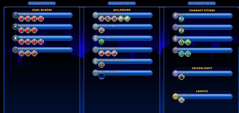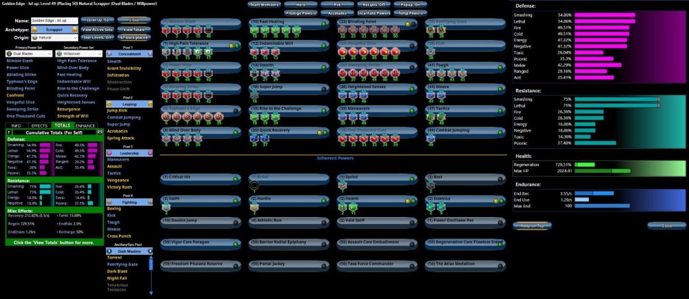17. Golden Edge - Excelsior I started playing this morning. It's been a very fun build so far. I have made quite a few changes as I've leveled up ( made 19 solo, then joined a DFB for the badges 🙂 Made 20 with that fine team. ) The new build looks like this: Golden Edge - Scrapper (Dual Blades - Willpower - Dark).mbd I'm still in the air about Typhoon's Edge. I had a full set of Attuned Overwhelming Forces attuned in storage so am using that. I like the knock down so put it in, for now, as permanent. I lose out on a significant about of fire/cold res and def. The Def is not really an issue. The res is kinda a big deal. The Melee Def is a BIG deal. I just don't know. For now the choice is easy as I couldn't slot the superior avalanche set until 50 anyway. At 20 I look like this: Final Build tentatively is this: |MBD;25691;1662;2216;BASE64;| |G1pkERWcThAtDmxjS5NNpI1SwRSuk0Ofn5xelpbMslJEkyM/oCrDFtGbqpVVe1B/brq| |kzV8PuNZ4zSwtGiTl+5etlTr5TeMUdjrgpMTXZtHp6gtuuFgFp55YfrSWJk5GyArHu1| |X/wtbY7u3shVEVSCHsQUDl3gV0SUgAEKa6SgA6lKI7amdUgGVd4/5V38vWZOkOLY71s| |kMNGEZpSHG0hViREil6eivgPFt67fn0my4caBD8kpbz7nY67hyQQuptcYj2AnuM9TCl| |ifNkdrmfwpFBqtx3eQZYu711776oa8h5Mhp/pYiOBJS+hvRZUCNJveZBDG8EvY6EV1U| |UdMLzk132NN9P3+HHA/rCBrec8YeVrfNSXwU9jVx4igFNOrMZDc2MVPJYgTdW6Oe6xG| |2xwURm6LaOcvqCHmDJY5mjEdt65Yacui4s8RjMRC9ZjLc2Osmidkdr7oSDPrGtx/oM0| |i5P65C6RbSrAf9iidDfD++NWlJ/com6lOzt9PB1IATfRmJvQQg+sVUbNnbGYSf/Ma/8| |l+zHyeq8Udn7TGSTbb9+p+UTha8F2sD0m7U3Zu0s8TpDtmJHq4OlK8iPmxSgEUM6WwY| |fbJg//869bIj0wcAzyMXRkKmDV33DL9T0PNlfXUV8XV/olVuw+URQIYytxlJh5Jh6b3| |t5eAK1CLnlndRub0cOaaOxliWZu8FFByY3xnNhHUXsrUXpqfYI5DvSB70p5EDw/MSjS| |VcpjwTE4QFlEcevd7PjZFzqMyH5nJ6lvTLFgg8UV+7Ui5C6Tp94cATVJDXqSM5VKGF3| |lbtNONI1GDX4jJ05KTuDUpBohGIIrVnX6ugCPgGf0/GZbo5GwuTg32KGTVgY+CueBG0| |VVM0Rqc1Xh9p37uQrsz+aeUVQIXjQlgxDfpgV8KElK/29DjprUdHWiufovvyP4Nc2j2| |USipaigzgl+masFZrdMWNuGTIM2cEkAF6NShYSxRZ5EC47yrXZf5iHDslzWRqXGJMjp| |zEVWmSTIfiwYJdBRiD9cEnAD7bR/dCK4dRwOxYhbAx9CWeRyYMFKKnPpgllkCFBho1j| |46UNLrvUoljt/EkYCOb/Wd2V1rGKGTSr1l4oRmPijJUsASaeZtdMVCSmdlFCVAvNSDb| |frrv6RZw5C169VrbWhAqqmQOUfD2yaBJ/x38nlD3Z/j08c6EyBQRgmw+ecZUsJQHgEo| |MHGtEaoejNXvJMuOwol7VlXuugqG4aMWbvsj+qMRFO0Gu7LMScxuTHlq4c2UbTZCOKO| |w9E0yzGTilEdCjX4UuTzjKCCsEbQIbhy4KKYIpMAZPIEKojbI4jQRa1wkUW4SDj5jKU| |qBX6YKTo3ziCeQQVgoeADMO7BwQjz/QGo2h07RPdhfQ1iqehI5TGv9vyjkDWxBtkTbx| |B1sQbTJap6Zq/dST6Eo5knqevH3Lsp9aE0IfXL2T9o6IcNyu68UBUUxHkn3VzEYb1lc| |oDg1tnwl36OLfdxcQpc7i6Fuj4zl8YmrAh2MHqXxwqEAByZTabCDYJZBgy4VLgXCqcr| |CbjSxZnhW5vOu6I8p4mE5x5dDgJnpNRUk3zkW5xQWALCJa7FFEiyvz6BWrVZTYDODxX| |Ibbt2nDnHpK7j3oPLpl83nc7fRGyQl5La1ZIf/OpMbaYYDIIuc0oQ5YMfwDbcqVcJAy| |YZRZydsCUKECD0GyGIHwQfHuh/595V7cvaxnpuJ+yf0RTFvlYXRVeXdUAmyUIBzwntJ| |lr03I3LCtfzklL3dVg6V0VMeTFtHLB+zCM71BdVWyJpKPjeT+QUS3ym3uBOP4cC7MUN| |P3Gvljam9NGMWKe5Z1/CbeZ3/Wil8JfG3q1ri+6lcarlaDM4ZcldZrRjVal1CicdWUw| |pE0xchmyUjQgClZ56jVkNUJnIpMjo5K65NAh++DZG7GSfHdmGrINve5naHVrHx2oVDf| |c56d6MEvvBJSxdE2QLMpZojsBrLC4dq2nBdtGMktG49ungwnf7EeuaiblAWfuGgUHnL| |RKDCkuv9zNmovePUAel0rI3ZmE2khbpCe6l5mNI4ZGsn4RinQVg5x67jLeaEfFvw9Pb| |7fQvjSTVR8PkOPmXWMhtLbhb6RTyGxqfvtFN5ytJi/GTEyGC/+Erd3QAfSQXGBdXSAD| |1v9yOnwXk/GKlpui8nakd4Vu/WrpicbXB99oV60HAZ1iYRtGEHVC3Z64/rNLomcXM/V| |xat0B|