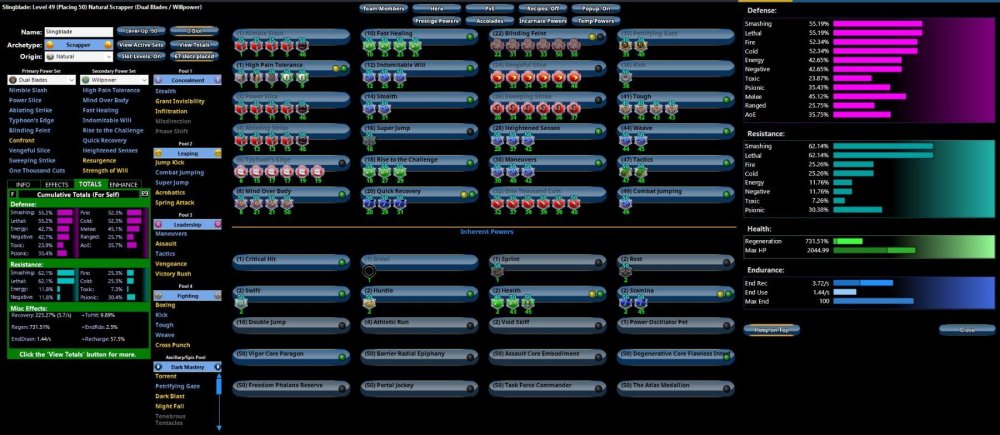 19. I've yet to give Dual Blades a go on any AT. It seems like an interesting set to play so here we are. I over-baked the defenses a bit with the understanding I'll lose a bit of Stealths contribution when I am attacking. I chose not to take haste, which is always a tough choice for me, but I feel like I have enough in the way of attack options to cover that. And therein lies my question, am I trying to include too much? I'm not familiar with the combos, and finishers. I'm certain those with experience with this power set can enlighten me. I did peruse the forums a bit, as well as reddit. Still, I'm never one to rest on my laurels 🙂 Any knowledge is greatly appreciated. Slingblade - Scrapper (Dual Blades - Willpower).mbd |MBD;25743;1609;2148;BASE64;| |G45kERWcUggtDnhzLuQFS4VoYHP+Ou7rqBSdHdHkyA+oyrBF9ItzKl99QhkqYDo08tg| |sOl19wQ2GsQrM5y+13qrNaHo1XdLmrhlWerbJYtAA9j/j9y1rh3UgXO5G3QiLsfR0zR| |ByUDHUblaw6qIlCZeyisKgUSIla7pI/YsYhOMcp3h4t3JtjJ9/63iJDhuZP6aHXJGTK| |bpyK2CtliIzvwww4sIGxTdoOe92p+POhl9DxLSYxNsB78XGc6o4d2X395M5QkgD1l+e| |Bt6e0Xp5WRpH8FqIxv9SxMy4lPkN8bNlJ6xmugnCG27vehlVbH8oTzT8kE1azAaT7PU| |bla0zh42pQIEuDjiNcMQu2fSn1kU6MazU9tr8xI5y7cF4J+u8PIOX4X0XJoaVHTJprZ| |tuyJLRmeNpyKTCWYi3NjJnkbuyNVfKSY3Y6MOEdCMDl2mS8V2iayL980rk1r1lb4zFp| |dtqeku33ioNH13J1U4i7ZY63Cu0aiPYgYDVb2e5/G9iHnoarweZ856hON2cgFkhp5TP| |jJSA+U9rXcwyOeFWBm+FSUkMJYPIzwcXQcMFT7RUNzSCz2DVXjYk+ajrXuSGNUTpaLa| |3+R+rshbm7J1/N/s/gu02jJ4IFILdRmF0MLO5Zws/PQmlQHJNnB+3HfccyvXGpna/uB| |gpi9HkipiY1F7EurHAM6yuo9hG+U7v0/Yz8zPvlKdweSRBnB67mCDZ8A4czoW4xS8n7| |lw+S4P7SMoqV8kNkrT+VAgsOYKnGtJ6HKWjFPRzQPbChQOuoaeh5+PzKW2+ikibcn0I| |r0uXrXGBnuAzqiwUDV6MJDtKLHoG/+o5jMBQ1whxNDRZ5c/WiKDqMkyCm5VtHBHLzld| |TDYOwv8oSYBj2X1mBHjZr5RGK2KR2Iwh9vnl1uBcJMnzTZyuJcMT8dchdHHPZ6RbRui| |JQGEl3SeICT8ZyFnmwFnkA12Y/13LDep1inKcmyG5WJGzgFkPoVpcAw7DfohQybBps+| |inlW7ge3EUCG4bt9J60QvTa6H+AHJ8PRawjaLJhBPY3tECmRPn+cftYYK2Dj4GBsuAz| |HvEECXds1LPbTpp9+HXIobmEcjI8/lvFpiWpUPp8EAUfmw6SoL9/8LmyIm7htUlQ2RV| |RIGyUTt2NHb15PFKNXpNIURnbfroutLOLy2yOJ0VrQSGCJxsFkXwkiXiA/4bJRpoDxm| |Rs6+osO5Ox1UOVLITYTuQ6I0u1px0GEUugMEGgjLzKFxoLJPENqQrAyHQEpKyTzrbIu| |2WGHpOXP6hCnvAV44spYBDxAeUJKIyPj4PuAon80cFPuAPrkyl7pjVQLqJjFdAivlko| |T1CeASOIbiFJkbivbTseVLu+9emfAl9+k7ZXhqHsFsR9xjHYrzGeOJydP90UPrMpfD2| |huLjMKK6vhNk1+wtHAxuGnX7lSng5Agdy6YVB2Hw1CWoyUAQJUsEFw6WVVDxOV1TI9i| |a2k+P3QBmwE+l0NNw7I6eo5DMNU4E3hmuWKE2xBazZpVCNybj+dWGcAwJOVpgNr4528| |MF5WGn04KjJr/3YfLoI7YxmDFA0RIoNhhdwk9wpTTEMwm4UZdiS2ruwUVfwDWCgLWlI| |+EbtsxSoEWacI4AXhncdzH9XvvZtuvqdiO2FUZVTjQxCvb4uuru4LpwngB86f/Zddpn| |cX+eZ5b+yl9I2VSnBfSIGv6hSLPogavgRjR+VSXJThyzUXuV1Klk7b3O/hs7zXQekjQ| |Ibhn12BitEXKu2/wjVK7/JjQv9P0H31eOLbKV06ncwXGaZ/Wh/xVRs0rBahBNVDZN58| |X9WJHgoyKYmS1ft0Mwmfo5dZeMBJrX2Xui0YkuU+BJ8fZOkaRGi5L6JkMFXZaz8dF0N| |ZMkOglKUjBCVSFeJ9U6gRYvLVJvasG00q2RMelt1OmTz/D2HqHJ5kCJ9UNoEuwwO40L| |/c98MusjuQeRxNAfvziUoLS9SOdXzGNmiYmpZ62PRwFNYSZasg+2NeFEsfEv/9giZvW| |2t/rCJnA+f4g1Jtcr/sDqNjPbpz7hhiH2t8osik4aThYHyJnJ4F7pJdhjDRUrod8a8J| |+nByvZKzT2t5PMQxBi+yaz9T4o+nngj3jU5ZDy1wGMyNXxE0Ov4I3Rt2jmpYLKquB2n| |7Q==|