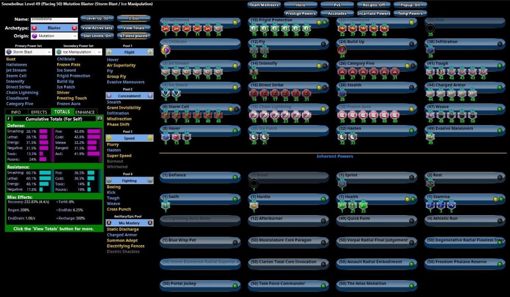 A few things to further define my thought process. I keep evasive always on. I toggle between Fly or Hover, but Evasive is a constant. I use it like a defensive toggle ( which it is ) with a side benefit of amazing flight control. Invaluable to this old timers waning reflexes 🙂 Stealth and Infiltration are indeed mules. My goal was a interdiction blaster. Max recharge so that I have as many offensive option at my beck and call as possible to control the battle field. Ice Sword for when I run Oro missions. I like having a good melee option at those lower levels. Also this was built as a leveling build. Far too often I've been giving builds that are functionally inept at leveling, clearly being respc, end-game builds. I know they will eventually be as delivered, but without the funds to pimp them out I find them frustrating to attempt to play. I don't power level, FF or any of that. I like to do the story arcs and task forces as intended, and at appropriate level when possible. Jet Stream is only used when Storm Cell is active, which is often, as it turns out. I wanted HP's. I want MORE, but what I have was a balance between HP and Res/Def values that keep my old butt in the fight. Having said this, I read a lot about soft cap, but nothing of hard cap. Is there a definite "this is the most XXX AT can have for this defensive stat? And if so, are they different between Resistance and Defensive? Being blind to that specific knowledge I built in more resistance as a sort of buffer for when defense falls. The biggest issue for me was trying to eek in AOE defense. I just don't know enough about it's value, and the sets that provide it ( or if they are even worth pursuing ). I'm pouring over your sample build looking at slotting choices and such. Thank you kindly.