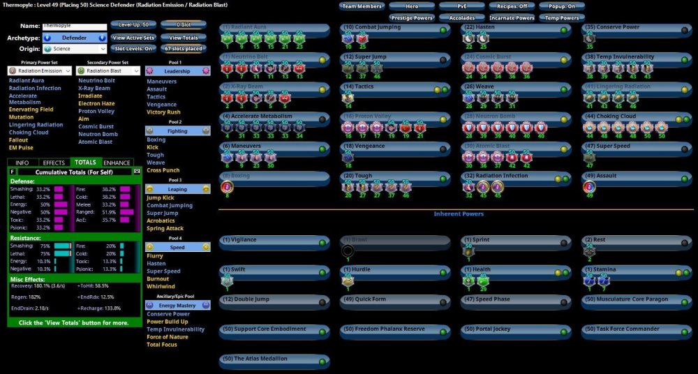 Hello it's me again 🙂 I'm taking a tour of the ATs ( as you do ) and have started with a defender as of yesterday. I'm taking Proton as a starting base with the idea that since he is multiple beings ( either real or fashioned ) I would tap further into that thought process and create another. His outfit subtly calls to Protons look but is different. My further idea was for him to be party-centric. I want him to do well solo, but shine in a group. I've read a lot in the forums before creating my Mids. A few things to address: I had Irradiate in, and opted to take it out in favor of choking cloud, later in the build. a) Reasoning - I have plenty of attacks - I needed some control aspect to allow me to wade in, when needed, and give heals or deliver my hard hitting Pbaoe's ( realizing that Irradiate is one as well ) b) Further reasoning - I've grown fond of using Neutrino and X-ray as a rapid fire "Always something to hit with" option while the hard hitters are on cooldown and/or I'm healing/buffing. I furthered their utility via enhancement options. I really wanted to be durable. Defenders evoke the idea of toughness, so I wanted to lean into it. I did the best I could but honestly feel like this is one of my better first attempts. I like it. https://api.midsreborn.com/build/download/Fxwur0u3Iwjx164N Thermopyle - Hero Defender Build plan made with Mids' Reborn v3.7.5 rev. 21 ────────────────────────────── Primary powerset: Radiation Emission Secondary powerset: Radiation Blast Pool powerset (#1): Leadership Pool powerset (#2): Fighting Pool powerset (#3): Leaping Pool powerset (#4): Speed Epic powerset: Energy Mastery ────────────────────────────── Powers taken: Level 1: Radiant Aura A: Numina's Convalesence: Heal/Endurance 9: Numina's Convalesence: Endurance/Recharge 15: Numina's Convalesence: Heal/Recharge 15: Numina's Convalesence: Heal/Endurance/Recharge 21: Numina's Convalesence: Heal 23: Numina's Convalesence: +Regeneration/+Recovery Level 1: Neutrino Bolt A: Gladiator's Javelin: Accuracy/Damage 7: Gladiator's Javelin: Chance of Damage(Toxic) 11: Achilles' Heel: Chance for Res Debuff 11: Touch of Lady Grey: Chance for Negative Damage 13: Shield Breaker: Chance for Lethal Damage 13: Invention: Damage Increase Level 2: X-Ray Beam A: Gladiator's Javelin: Accuracy/Damage 3: Gladiator's Javelin: Chance of Damage(Toxic) 3: Touch of Lady Grey: Chance for Negative Damage 5: Shield Breaker: Chance for Lethal Damage 5: Invention: Damage Increase Level 4: Accelerate Metabolism A: Preemptive Optimization: Accuracy/Recharge 31: Preemptive Optimization: EndMod/Endurance 33: Preemptive Optimization: EndMod/Recharge 33: Preemptive Optimization: EndMod/Accuracy/Endurance 33: Preemptive Optimization: EndMod/Accuracy/Recharge 34: Preemptive Optimization: EndMod/Endurance/Recharge Level 6: Maneuvers A: Luck of the Gambler: Defense/Increased Global Recharge Speed 9: Reactive Defenses: Defense/Endurance 23: Reactive Defenses: Defense/Endurance/RechargeTime 50: Reactive Defenses: Scaling Resist Damage Level 8: Boxing A: Chromatin Exposure Level 10: Combat Jumping A: Luck of the Gambler: Defense/Increased Global Recharge Speed 25: Kismet: Accuracy +6% Level 12: Super Jump A: Blessing of the Zephyr: Run Speed, Jump, Flight Speed, Range/Endurance 37: Blessing of the Zephyr: Knockback Reduction (4 points) 46: Winter's Gift: Slow Resistance (20%) Level 14: Tactics A: Gaussian's Synchronized Fire-Control: Chance for Build Up Level 16: Proton Volley A: Superior Vigilant Assault: Accuracy/Damage 17: Superior Vigilant Assault: Accuracy/Damage/Endurance 17: Superior Vigilant Assault: Accuracy/Damage/Endurance/RechargeTime 19: Touch of Lady Grey: Chance for Negative Damage 19: Sting of the Manticore: Chance of Damage(Toxic) 21: Gladiator's Javelin: Chance of Damage(Toxic) Level 18: Vengeance A: Luck of the Gambler: Defense/Increased Global Recharge Speed Level 20: Tough A: Gladiator's Armor: Resistance 27: Gladiator's Armor: TP Protection +3% Def (All) 27: Unbreakable Guard: Resistance 37: Unbreakable Guard: Resistance/Endurance 46: Unbreakable Guard: +Max HP Level 22: Hasten A: Invention: Recharge Reduction 25: Invention: Recharge Reduction Level 24: Cosmic Burst A: Superior Winter's Bite: Accuracy/Damage 34: Superior Winter's Bite: Damage/RechargeTime 34: Superior Winter's Bite: Accuracy/Damage/Endurance 36: Superior Winter's Bite: Accuracy/Damage/Recharge 36: Superior Winter's Bite: Recharge/Chance for -Speed & -Recharge Level 26: Weave A: Luck of the Gambler: Defense/Increased Global Recharge Speed 29: Shield Wall: Defense/Endurance 31: Shield Wall: Defense/Endurance/Recharge 31: Shield Wall: +Res (Teleportation), +5% Res (All) Level 28: Neutron Bomb A: Superior Defender's Bastion: Accuracy/Damage 39: Superior Defender's Bastion: Damage/Recharge 39: Superior Defender's Bastion: Damage/Endurance/Recharge 40: Superior Defender's Bastion: Accuracy/Damage/Endurance 40: Superior Defender's Bastion: Accuracy/Damage/Endurance/Recharge 40: Superior Defender's Bastion: Recharge/Chance for Minor PBAoE Heal Level 30: Atomic Blast A: Superior Vigilant Assault: Damage/RechargeTime 36: Superior Vigilant Assault: Damage/Endurance/RechargeTime 37: Superior Vigilant Assault: RechargeTime/PBAoE +Absorb 42: Obliteration: Damage 42: Obliteration: Chance for Smashing Damage Level 32: Radiation Infection A: Achilles' Heel: Chance for Res Debuff 45: Enzyme Exposure 45: Enzyme Exposure Level 35: Conserve Power A: Invention: Recharge Reduction Level 38: Temp Invulnerability A: Steadfast Protection: Resistance/Endurance 39: Steadfast Protection: Resistance/+Def 3% 42: Steadfast Protection: Knockback Protection 43: Gladiator's Armor: Resistance 43: Gladiator's Armor: End/Resist Level 41: Lingering Radiation A: Pacing of the Turtle: Accuracy/Slow 43: Pacing of the Turtle: Damage/Slow 45: Pacing of the Turtle: Accuracy/E