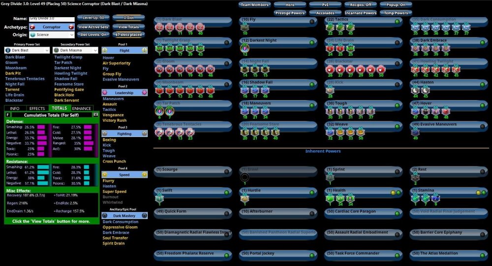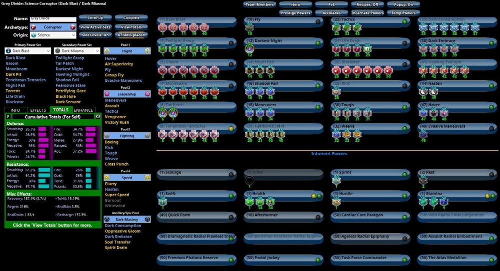 Made 17 fairly smoothly. I knew going in, it was an end hog so early SO slotting has this in mind. damage powers are acc/end redux/dam on fast casting ones and the end redux is swapped for a rech redux on the longer ones. Seems to work ok so far. Selective use of the toggles is mandatory. In a fast kill group darkest night is shelved to help that little bit. Final slotting looks to add as much endo recovery as I can without compromising the other facets. I also tried to make sure my accuracy was over 50 (including the tactics %). We'll see how it goes 🙂 I wanted more knockback protection and higher melee def. Any thoughts? EDIT: After sleeping on it - I went back and tweaked the build a tad. I'll include the new version below this original post. Grey Divide - Corruptor (Dark Blast - Dark Miasma).mbd New Version: Grey Divide 3.0 - Corruptor (Dark Blast - Dark Miasma).mbd