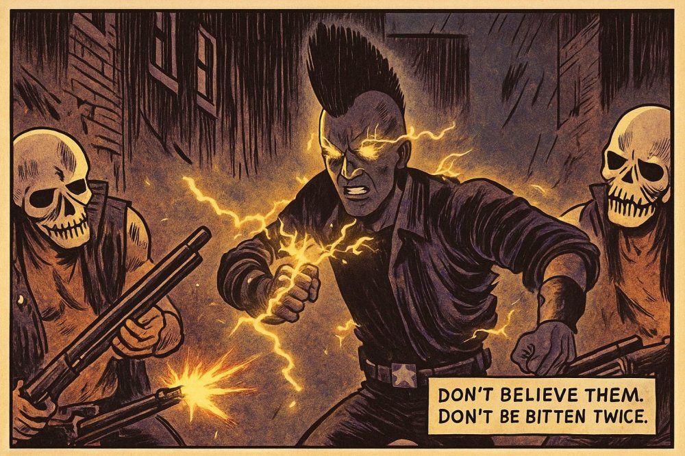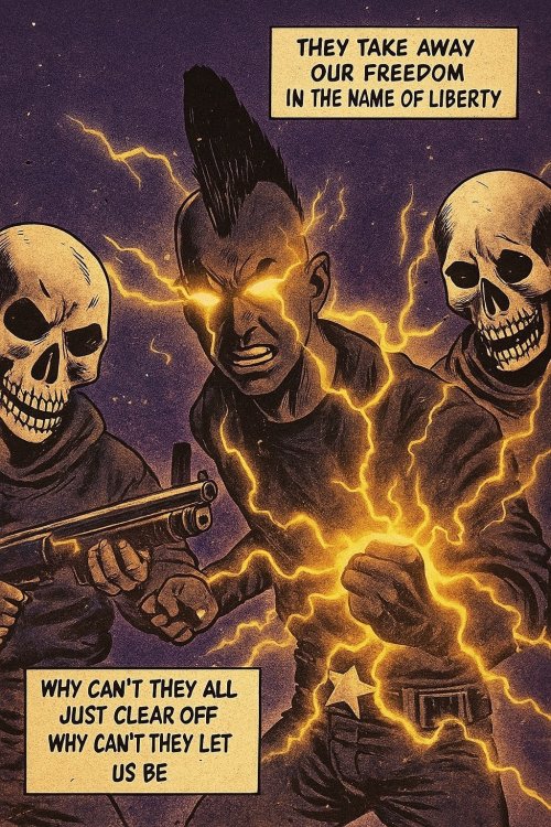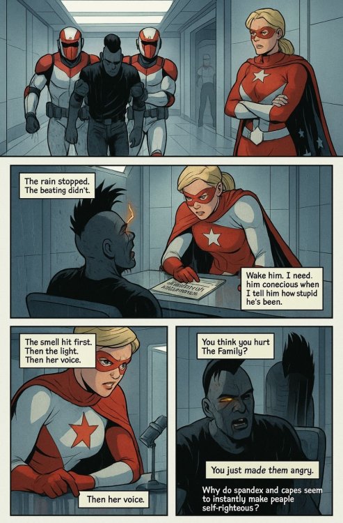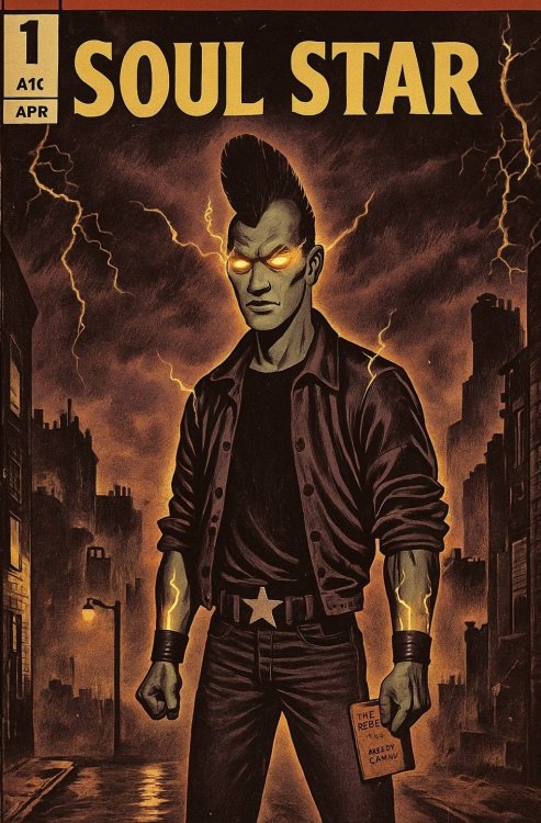 PAGE ONE — FULL SPLASH PANEL Paragon City at midnight. The skyline seethes beneath a violet thunderstorm. Black lightning tears across the clouds, swallowing light rather than casting it. At the center of the chaos stands a young man with charcoal skin and yellow eyes blazing with solar fire. NARRATION (top-left): They say I’m a freak of nature. NARRATION (bottom-right): Aren’t we all? ---------------------+++-------------------- PAGE TWO — THREE PANELS Panel 1: A prenatal scan bathed in distortion — a fetus outlined in a flicker of dark light. NARRATION: They call it a mutation. Exposure in the womb — dark matter, neutronium, a quantum flux that struck me shortly after conception. It rewrote my DNA before I ever took a breath. Panel 2: Microscopic view — twisted helix glowing with black plasma, particles orbiting like trapped suns. NARRATION: Now I can attract dark matter particles and weave lightning from the void, I can even see neutrinos slice the night sky. Panel 3: Close-up of Soul Star’s eyes — tiny solar eruptions flare within them. NARRATION: So yeah — “Mutant.” And proud of it. ---------------------+++-------------------- PAGE THREE — KING’S ROW Panel 1: Soul Star striding through rain, mohawk sharp against the glow of a flickering streetlight. A worn paperback copy of Camus’ The Rebel sticks out of his back pocket. NARRATION: I wear a mohawk. Cuz' I figure I might as well double down on the freak card. Panel 2: He confronts the Skulls in a graffiti-stained alley. Lightning arcs from his fingers. NARRATION: You might see me around Paragon. Picking fights with the SKULLS. Don't ask why. One must imagine Sisyphus vengeful. Panel 3: He gets slammed against a dumpster, grinning through blood and static. NARRATION: Hey, I said I was a freak. Didn’t say I was powerful! ((Everlasting Roleplayer, new toon, combination of the old Marv Wolfman Teen Titans meets Gaiman's Sandman. George Perez art, but only after he'd listened to Disintegration by the Cure and used it as a muse. Come say to me. I go by @DoctorNorth or for this toon Soul Star. I like to RP old school, in local, a very low-level hero, naive, angry about something, favorite anthem is "Don't Believe the Hype" by Public Enemy. Hero side, looking for RP friends! ))