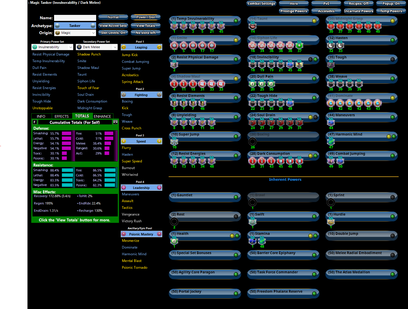 It is one of my builds also I think (at least based on the name since I'll often just add a number any time I make changes to a build and save to have easy comparisons). It's low on recharge bonuses as it also focuses on maxing resists while hitting soft cap defenses with 1 foe in range of invincibility. If you toggle on the SMoT proc and T4 barrier core which are turned off in the screenshot of the build, you'll hit 90% s/l/e/n/f/c resist. 89% on toxic and 85.9% on psionic. A second SMoT proc would cap those as well. You also want to reset the foes in range of invincibility to 0 and back to 1 when loading in invulnerability armor sets to see accurate numbers from it (you can right click on the power in Mid's to lock it so that you can easily go to the info tab and change values like foes in range or time elapsed from using a destiny incarnate power). I always set time elapsed on destiny incarnate powers to over 60 seconds to see the minimum values provided by the destiny incarnate which are in essence permanent if the duration of effects is 2 minutes, some do last only 90 seconds instead of 120. I made one other change to that build that sacrifices a tiny bit of e/n resist to add more global recharge which would be more useful to increase the uptime of Dull Pain to near perma (may be slightly off from perma during the hasten downtime periods). Below is the comparison of both with SMoT and barrier active, 8th version on the left and 7th on the right. Essentially I just distributed the Maneuvers slots to add more LotG pieces, did replace one of the Superior Blistering Cold to a heal IO to increase the amount of HP restored since the f/c defense at 53% was overkill. Posting the 8th version of the build below. Edit: one small side note just in case, I did boost the PvP set pieces like Shield Wall to +5 in mids. This can be slightly expensive but will boost defense a bit higher and you still will get PvP set bonuses when exemplaring even if they're not catalyzed and are boosted to +5. The same is not the case for none PvP sets like Unbreakable Guard, I would recommend getting the catalyzed versions of those IOs on the market (or crafting if you have recipe drops and using a catalyst) so that the set bonuses exemplar with you when doing content below 50. Tanker (Invulnerability - Dark Melee)8.mbd