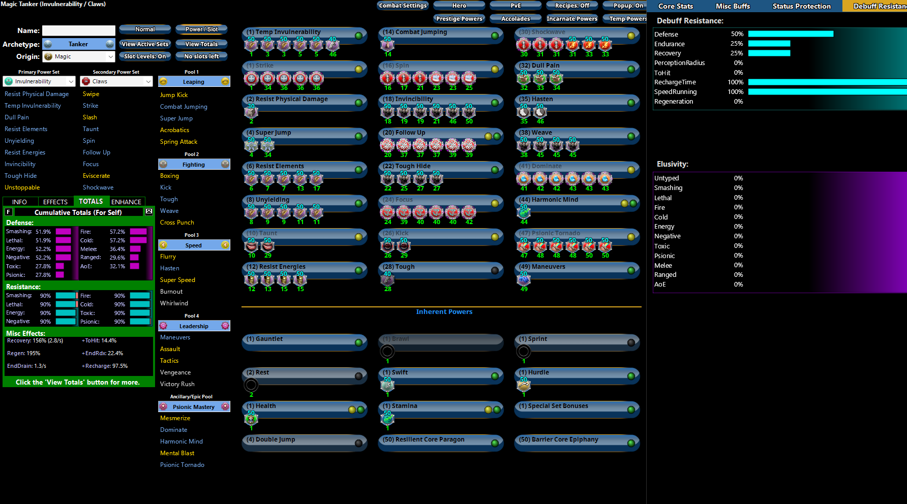 One small comment that I'll make is that the infographic is a tiny bit misleading if you're just looking at the resist/regen values. The resist and regen totals that are shown are with the melee core hybrid toggled on and set to 10 foes in range (this has a 2 minutes active and 2 minutes cooldown, so not permanent stats). You are able to cycle between RoP, melee core hybrid (for 45+ content), and MoG to where most of the time your resists will be at these values (assuming melee core hybrid is fully saturated). Without melee core hybrid, RoP, or MoG toggled on, this sits at 70% s/l resist, 57% e/n, 65% f/c, 64% tox, and 44% psi (these values are counting the 5% res/def minimum from T4 barrier core and 1 stack of SMoT which adds another 6.7% resist). The regen rate will be at 1175% and 173 hp/sec without melee core hybrid toggled. As @VoidSpawn stated, aside from procs/uniques, all other IOs on the build are boosted to +5. Void Mod Spaghetti Betty - Hero Tanker Build plan made with Mids Reborn v3.7.14 rev. 3 ────────────────────────────── Primary powerset: RegenerationSecondary powerset: Super StrengthPool powerset (#1): SpeedPool powerset (#2): SorceryPool powerset (#3): FightingPool powerset (#4): LeadershipEpic powerset: Earth Mastery ────────────────────────────── Powers taken: Level 1: Reconstruction A: Preventive Medicine: Heal3: Preventive Medicine: Heal/Endurance5: Preventive Medicine: Endurance/RechargeTime5: Preventive Medicine: Heal/RechargeTime9: Preventive Medicine: Heal/RechargeTime/Endurance11: Preventive Medicine: Chance for +Absorb Level 1: Punch A: Superior Gauntleted Fist: Damage/RechargeTime11: Superior Gauntleted Fist: Damage/Endurance/RechargeTime13: Superior Gauntleted Fist: Accuracy/Damage/Endurance/RechargeTime Level 2: Quick Recovery A: Performance Shifter: Chance for +End7: Synapse's Shock: EndMod7: Synapse's Shock: EndMod/Recharge9: Synapse's Shock: EndMod/Increased Run Speed Level 4: Haymaker A: Superior Might of the Tanker: Accuracy/Damage13: Superior Might of the Tanker: Accuracy/Damage/Recharge15: Superior Might of the Tanker: Accuracy/Damage/Endurance/Recharge15: Superior Might of the Tanker: Recharge/Chance for +Res(All)43: Superior Blistering Cold: Accuracy/Damage43: Superior Blistering Cold: Accuracy/Damage/Endurance Level 6: Ailment Resistance A: Miracle: +Recovery Level 8: Integration A: Preventive Medicine: Heal17: Preventive Medicine: Heal/Endurance17: Preventive Medicine: Endurance/RechargeTime19: Preventive Medicine: Heal/RechargeTime19: Preventive Medicine: Heal/RechargeTime/Endurance Level 10: Taunt A: Perfect Zinger: Chance for Psi Damage Level 12: Hasten A: Invention: Recharge Reduction21: Invention: Recharge Reduction Level 14: Mystic Flight A: Winter's Gift: Slow Resistance (20%) Level 16: Resilience A: Unbreakable Guard: +Max HP23: Unbreakable Guard: Resistance23: Unbreakable Guard: Resistance/Endurance Level 18: Boxing A: Superior Blistering Cold: Recharge/Chance for Hold42: Superior Blistering Cold: Damage/Endurance/Accuracy/RechargeTime Level 20: Knockout Blow A: Superior Gauntleted Fist: Accuracy/Damage21: Superior Gauntleted Fist: Accuracy/Damage/RechargeTime29: Superior Gauntleted Fist: RechargeTime/+Absorb29: Gladiator's Strike: Chance for Smashing Damage31: Unbreakable Constraint: Chance for Smashing Damage31: Force Feedback: Chance for +Recharge Level 22: Reactive Regeneration A: Panacea: Heal25: Panacea: Heal/Endurance25: Panacea: +Hit Points/Endurance27: Panacea: Heal/Recharge27: Panacea: Heal/Endurance/Recharge Level 24: Rage A: Invention: Recharge Reduction36: Invention: Recharge Reduction Level 26: Second Wind A: Panacea: Heal/Endurance33: Panacea: Endurance/Recharge33: Panacea: Heal/Recharge33: Panacea: Heal/Endurance/Recharge34: Panacea: Heal Level 28: Spirit Ward A: Regenerative Tissue: +Regeneration Level 30: Foot Stomp A: Armageddon: Damage31: Armageddon: Damage/Endurance34: Armageddon: Chance for Fire Damage34: Eradication: Chance for Energy Damage36: Perfect Zinger: Chance for Psi Damage36: Force Feedback: Chance for +Recharge Level 32: Tough A: Unbreakable Guard: Resistance39: Unbreakable Guard: Resistance/Endurance39: Unbreakable Guard: RechargeTime/Resistance Level 35: Rune of Protection A: Unbreakable Guard: Resistance37: Unbreakable Guard: Resistance/Endurance37: Unbreakable Guard: RechargeTime/Resistance Level 38: Cross Punch A: Superior Avalanche: Accuracy/Damage39: Superior Avalanche: Accuracy/Damage/Endurance45: Eradication: Chance for Energy Damage45: Obliteration: Chance for Smashing Damage46: Fury of the Gladiator: Chance for Res Debuff46: Force Feedback: Chance for +Recharge Level 41: Maneuvers A: Luck of the Gambler: Defense/Increased Global Recharge Speed42: Shield Wall: +Res (Teleportation), +5% Res (All)42: Reactive Defenses: Scaling Resist Damage48: Reactive Defenses: Defense/Endurance Level 44: Fast Healing A: Preventive Medicine: Heal45: Preventive Medicine: Heal/Endurance48: Preventive Medicine: Heal/RechargeTime50: Preventive Medicine: Heal/RechargeTime/Endurance Level 47: Salt Crystals A: Fortunata Hypnosis: Sleep/Recharge/Accuracy48: Fortunata Hypnosis: Sleep/Endurance50: Fortunata Hypnosis: Sleep/Recharge Level 49: Moment of Glory A: Luck of the Gambler: Defense/Increased Global Recharge Speed50: Invention: Recharge Reduction ────────────────────────────── Inherents: Level 1: Gauntlet Level 1: Brawl A: Hecatomb: Damage3: Hecatomb: Damage/Recharge37: Hecatomb: Chance of Damage(Negative)40: Hecatomb: Damage/Recharge/Accuracy40: Hecatomb: Recharge/Accuracy40: Hecatomb: Damage/Endurance Level 1: Sprint A: Celerity: +Stealth Level 2: Rest A: Invention: Interrupt Reduction Level 1: Swift A: Invention: Run Speed Level 1: Hurdle A: Invention: Jumping Level 1: Health A: Numina's Convalesence: +Regeneration/+Recovery Level 1: Sta