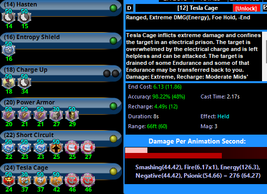 Can depend on preference, I find Tesla Cage to have very good damage. It's slightly lower damage per activation time compared to Zapping Bolt, but it does easily beat out Charged Bolts and Lightning Bolt which don't proc well and are below 200 damage per animation. I run 4 attacks for my ST rotation, Charged Bolts, Zapping Bolt, Tesla Cage, and Havoc Punch (also proc'd out) from electric mastery. Below is the damage per animation time of both Tesla Cage (4 damage procs) and Zapping Bolt (no procs) on my build (it is elec/energy instead and not elec/psi). Does include musculature alpha and reactive interface on the mid's build. They are nearly identical. The damage per activation on Tesla Cage with 4 procs is 598 according to mid's. Really comes down to preference and how/what you enjoy more. I find the additional 0.5 second animation time of Tesla Cage (as compared to Lightning Bolt) to be well worth picking it over Lightning Bolt since it has high proc rates.