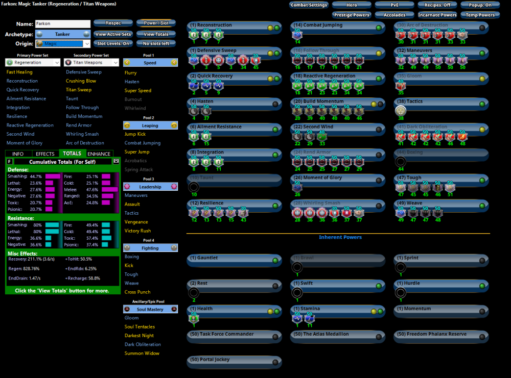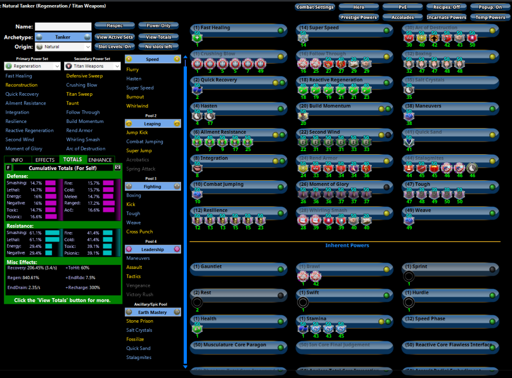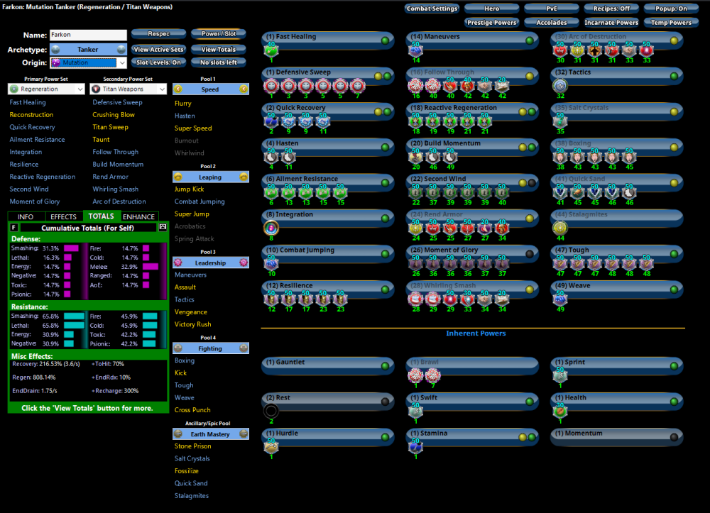So I hit level 50 and gave a crack at making a build, dunno if it's any good but I have a decent amount of regeneration, which was what I wanted in the first place. Hero Tanker Build plan made with Mids Reborn v3.7.14 rev. 3 ────────────────────────────── Primary powerset: RegenerationSecondary powerset: Titan WeaponsPool powerset (#1): SpeedPool powerset (#2): LeapingPool powerset (#3): FightingPool powerset (#4): LeadershipEpic powerset: Earth Mastery ────────────────────────────── Powers taken: Level 1: Fast Healing A: Numina's Convalesence: +Regeneration/+Recovery Level 1: Crushing Blow A: Superior Might of the Tanker: Accuracy/Damage3: Superior Might of the Tanker: Damage/Recharge5: Superior Might of the Tanker: Accuracy/Damage/Recharge5: Superior Might of the Tanker: Recharge/Chance for +Res(All)7: Superior Might of the Tanker: Accuracy/Damage/Endurance/Recharge49: Superior Might of the Tanker: Damage/Endurance/Recharge Level 2: Quick Recovery A: Performance Shifter: Chance for +End Level 4: Hasten A: Invention: Recharge Reduction17: Invention: Recharge Reduction Level 6: Ailment Resistance A: Panacea: +Hit Points/Endurance7: Panacea: Heal9: Panacea: Endurance/Recharge17: Panacea: Heal/Endurance25: Panacea: Heal/Endurance/Recharge Level 8: Integration A: Perfect Zinger: Chance for Psi Damage Level 10: Combat Jumping A: Luck of the Gambler: Defense/Increased Global Recharge Speed Level 12: Resilience A: Gladiator's Armor: TP Protection +3% Def (All)13: Gladiator's Armor: Resistance13: Gladiator's Armor: Resistance/Rech/End15: Gladiator's Armor: Recharge/Endurance15: Gladiator's Armor: Recharge/Resist23: Gladiator's Armor: End/Resist Level 14: Super Speed A: Winter's Gift: Slow Resistance (20%) Level 16: Follow Through A: Superior Blistering Cold: Accuracy/Damage25: Superior Blistering Cold: Accuracy/Damage/Recharge27: Gladiator's Strike: Chance for Smashing Damage27: Touch of Death: Chance of Damage(Negative)29: Explosive Strike: Chance for Smashing Damage29: Force Feedback: Chance for +Recharge Level 18: Reactive Regeneration A: Miracle: Heal/Endurance/Recharge19: Miracle: +Recovery19: Miracle: Endurance/Recharge21: Miracle: Heal21: Miracle: Heal/Recharge23: Miracle: Heal/Endurance Level 20: Build Momentum A: Gaussian's Synchronized Fire-Control: Chance for Build Up Level 22: Second Wind A: Preventive Medicine: Chance for +Absorb31: Preventive Medicine: Heal/RechargeTime/Endurance31: Preventive Medicine: Heal/RechargeTime31: Preventive Medicine: Endurance/RechargeTime33: Preventive Medicine: Heal/Endurance33: Preventive Medicine: Heal Level 24: Rend Armor A: Invention: Accuracy33: Invention: Damage Increase34: Gladiator's Strike: Chance for Smashing Damage34: Hecatomb: Chance of Damage(Negative)34: Achilles' Heel: Chance for Res Debuff36: Touch of Death: Chance of Damage(Negative) Level 26: Moment of Glory A: Reactive Defenses: Defense36: Reactive Defenses: Defense/Endurance36: Reactive Defenses: Endurance/RechargeTime37: Reactive Defenses: Defense/RechargeTime37: Reactive Defenses: Defense/Endurance/RechargeTime37: Reactive Defenses: Scaling Resist Damage Level 28: Whirling Smash A: Superior Avalanche: Accuracy/Damage39: Superior Avalanche: Damage/Endurance39: Obliteration: Chance for Smashing Damage39: Eradication: Chance for Energy Damage40: Force Feedback: Chance for +Recharge40: Explosive Strike: Chance for Smashing Damage Level 30: Arc of Destruction A: Invention: Damage Increase40: Invention: Accuracy42: Fury of the Gladiator: Chance for Res Debuff42: Armageddon: Chance for Fire Damage43: Force Feedback: Chance for +Recharge50: Obliteration: Chance for Smashing Damage Level 32: Boxing A: Absolute Amazement: Chance for ToHit Debuff47: Absolute Amazement: Recharge/Accuracy47: Absolute Amazement: Stun/Recharge/Accuracy48: Absolute Amazement: Stun/Endurance48: Absolute Amazement: Stun/Recharge Level 35: Salt Crystals A: Invention: Recharge Reduction Level 38: Maneuvers A: Luck of the Gambler: Defense/Increased Global Recharge Speed Level 41: Quick Sand A: Ice Mistral's Torment: Chance for Cold Damage Level 44: Stalagmites A: Bombardment: Chance for Fire Damage45: Javelin Volley: Chance of Damage(Lethal)45: Positron's Blast: Chance of Damage(Energy)46: Superior Frozen Blast: Accuracy/Damage46: Superior Frozen Blast: Damage/Endurance46: Recharge Reduction Level 47: Tough A: Impervious Skin: Status Resistance/Regeneration48: Impervious Skin: Resistance/Endurance/Recharge49: Impervious Skin: Endurance/Recharge50: Impervious Skin: Resistance/Recharge50: Impervious Skin: Resistance/Endurance Level 49: Weave A: Luck of the Gambler: Defense/Increased Global Recharge Speed ────────────────────────────── Inherents: Level 1: Gauntlet Level 1: Brawl A: Superior Blistering Cold: Recharge/Chance for Hold42: Superior Blistering Cold: Accuracy/Damage/Endurance Level 1: Sprint (Empty) Level 2: Rest (Empty) Level 1: Swift (Empty) Level 1: Hurdle (Empty) Level 1: Health A: Numina's Convalesence: Heal Level 1: Stamina A: Performance Shifter: Chance for +End43: Synapse's Shock: EndMod/Increased Run Speed43: Synapse's Shock: EndMod45: Synapse's Shock: EndMod/Recharge Level 32: Speed Phase |MBD;24250;1584;2112;BASE64;| |G7leERWcJggtDnhzLuIFS4Xow0bVXdedjkrRt/Nn+lnVRqh31d6vPiE887JGwWAB481| |XdYrv0R2P7STAVDqU0FXac69ZdLr6EtiO/Hm327oFEQceSG4wNi9pWLVMZWdEZYRVe0| |wPqAm0d29HIWfklOajQmQOAGdm0xQRM+AyzxDeou1BujNAog/f6A0Ak1WGq5xw5q9Bb| |CuFl44vkivSMkXvpz7huihTZ70krDhEMP4M5chNThpiSP0Um4RuwN/FPk9HRb0/t2uc| |30LEuXkdBO5O6mk9S8ItIglVSkOUiDJASJ+ZFkn6e84hg7y/8gTFJhzhaxMyrvuHLur| |SV23iMUPuSDheN/mAV04YsG1tcVbx1Em+2kDYJnlFq/ETctnVnkkUiwz7LUyci186Nk| |GvRla3NP9BQ7TLsJyi1iZsVYad3Td+vc3aLlcL1G+yaovcIcbAuuyFHaql/48lGtKjN| |70yxlvtCN1Iss0o6Xt/FYYfSHj/s+iSKTP7e9Xaafb/56M4b06ge9RXqvlmVuFX6Elf| |8NOtk6KU18bka53qUqzwWwwFH+AgWsoE5QoHMeLbTM8JsnsUnC72G04I