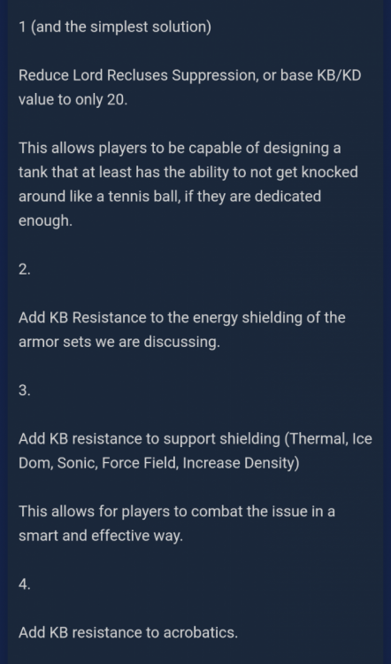 So you're suggesting the solution should be that if you don't take the damage aura, you would be able to have knock-back resistance in your armors? Essentially fire tankers without fiery aura would have knock back resistance? The suggestion is a blow to the ego of every single fire tanker ever made, but thematically it would make sense. Horrible backhanded sense... But sense. The problem is, right now we don't have that option. All crimson is suggesting is that acrobatics be the saving Grace if a tanker does not have knock-back resistance equal to or greater than 40 so as not to get bounced around like a pinball in a smokey barroom, during the Lord Recluse portion of the STF. As of right now it's almost impossible to get 40 knock-back or higher in a build without severely nerfing it. And even then it would be very hard. Due to this he is stating that he will use it was an accident an oversight or poor judgment. Any of which could be the case. Taking a step back and looking at this from the big picture if a change was made it wouldn't hurt anyone. Blasters corruptors controllers defenders... Everyone would win. It wouldn't make anybody overpowered. It wouldn't be game-breaking. making these changes would however open a plethora of options to archetypes that currently have no option as it pertains to knock-back resistance. I believe that's all he's asking for. And I applaud his effort.- 105 replies