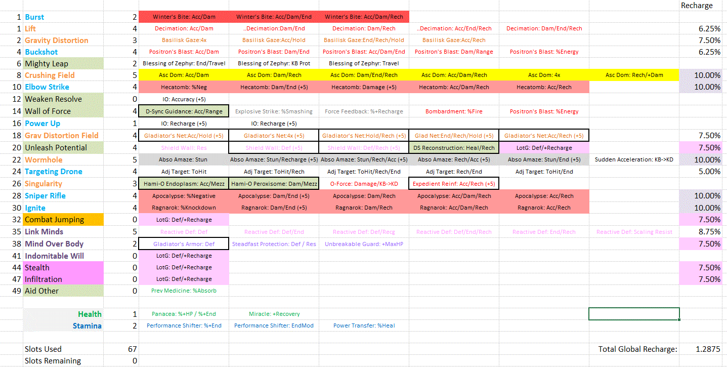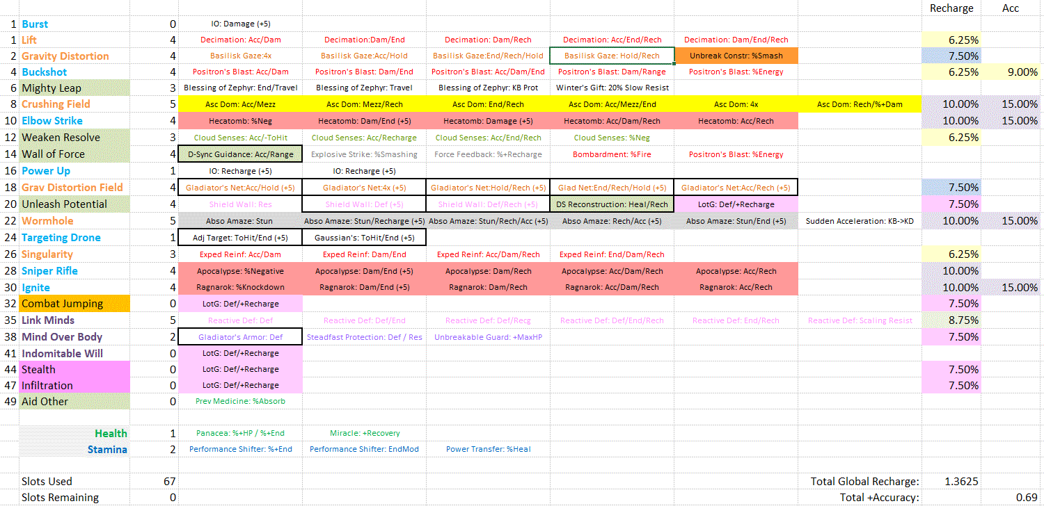 Here is an image of my post-50 slotting, now under experimentation: Some minor things to note compared to earlier prototypes: I swapped the slotting of Burst and Lift, as Lift does more damage, and I was using it more often while leveling. I goofed on my suggestion to slot a Hold set piece in Singularity, so I used a boosted Expedient Reinforcement enhancement for Accuracy/Recharge. I settled on dropping Maneuvers (Leadership pool) as we can only have 4 pools (plus one Epic pool). I miss Maneuvers, but it was one more toggle that was only ever going to have a LotG piece anyway. I slightly adjusted the chosen order of the Epic Psi Mastery powers, as I found myself using Mind Over Body more than expected. Some major things to note: I swapped out a %Lethal piece in Wall of Force for a Force Feedback %+Recharge piece. This is a pretty reliable %proc power because of its AoE. This build has achieved perma-Domination, but just barely. Some of the powers have long-ish animation/cast times; I found myself losing Domination unexpectedly during fights. I don't like relying on that %+Recharge proc, but I use Wall of Force quite a bit, so this was the best compromise (for me, for now). This also helps with a couple other long-ish powers like Link Minds and Unleash Potential. I have a few other options, that I'll rank in my order of preference: I could 4-slot Expedient Reinforcement in Singularity, for +6.25% Global Recharge (for level 27+ content) I could juggle slots to swap the Superior Winter's Bite in Burst for another 5x Decimation for another +6.25% Global Recharge I could replace either Combat Jumping (Leaping pool) or Aid Other (Medicine pool) with Hasten (Speed pool) I could juggle slots and convert the franken-slotting of Unleash Potential to use 6x Preventive Maintenance for +8.75 Global Recharge Supergroup Base buffs! (1) is sort of a no-brainer... but that would a somewhat minor reduction in the time on Domination. It is quite hard for me to tell if the Hami-O boosts to controls are doing anything for Singularity! I may play with this for a bit. The level range isn't that big of a deal, considering the marginal improvement in an already borderline Domination countdown. (2) would involve some compromises, but I can drop 5x Gladiator's Net to 4x Basilisk's Gaze, but I kinda like those PVP set bonuses (in PVE) and Winter set bonuses. I'd have also have to lose something else, probably either the Power Transfer %Heal or the Miracle +Recovery piece. Mighty Leap could probably go to fewer slots. (3) would be the easiest... and what I probably should have done while leveling up: take Hasten at level 22, delay Unleash Potential until level 32... and probably lose the Medicine pool (and the power that holds the %Absorb piece). I doubt I'd worry about trying to put a second slot in Hasten, but it is certainly possible. I suspect I could pull the third slot from Mighty Leap if push came to shove. Personally, I've already got a number of powers that I'd want on "auto" anyway: Power Up, Link Minds, Unleash Potential and Domination... mileage varies of course due to durations... so Hasten as perma somewhat loses its appeal. (4) I really don't like this choice. Even though I wouldn't need the Medicine pool (to hold the %Absorb piece), and a third power (Grant Invisibility) from Concealment can serve as a the 5th LotG mule)... I kinda hate losing the Shield Wall global set bonuses as well as the net boost to Defenses. (5) I may end up just using the SG base buff to global Attack speed, but I find it to be a PITA to refresh it every 60 minutes (don't believe the text of the power if it says 90 minutes!) Finally, in terms of "power/slot juggling" I can see one other potential area: Weaken Resolve should be able to take the Cloud Senses Accurate ToHit Debuff set... with 4 slots used there, I could get another +6.25% Global Recharge bonus. Three slots isn't that easy to come by! I could get two from Burst, and then maybe one from Mighty Leap.