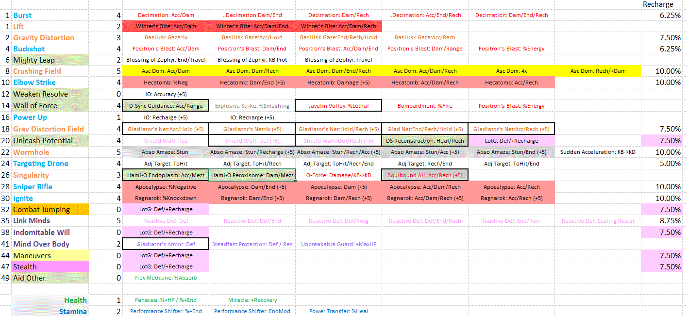 I realized I goofed on some of the proposed enhancement slotting: Epic Indomitable Will does not take Resistance pieces. This is not the first time I forgot this! As it takes Defense pieces, I'll have to make some adjustments.... and try to turn things to my advantage. With room for another (6th) defense power, I can opt to turn the franken-slotting of Unleash Potential into a 6xPreventive Maintenance for 8.75% global recharge. At this point I think I can sacrifice a LotG 7.5% global recharge (using a Defense slot to hold the Shield Wall global Resistance piece) and still have the margins to drop Expedient Reinforcement for Singularity. I kinda hate losing the Defense boosts from Unleash potential, so I am still thinking this trhough. I'm thinking about minimize some slotting on Singularity, leveraging HOs. EDIT: I had realized that I could skimp on Range for Wall of Force (to keep it closer to the range of Buckshot), and I could get better-ish enhancement values using an attuned 5-piece Decimation (even with a lower level cap) as the 3-piece Gladiator's Javelin in the Burst T1 attack... which allowed me to franken-slot the Singularity (and save another slot) more to my taste. The net Global recharge bonuses will scale lower; I lose a little on the Singularity's (slotted) recharge but I get it slotted with more control. I also get to keep my franken-slotting and Defense emphasis for Unleash Potential! Oh, BTW... the Singularity is showing a Boosted Soulbound Allegiance Accuracy/Recharge piece. That was just a placeholder. I'll be using a common Essence of Curare Accuracy/Recharge piece from the Hold category at level 50+5 instead. No need to burn INF on that.