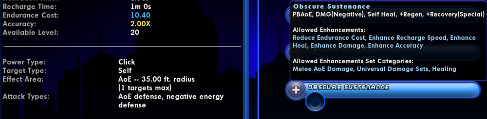 Though I understand these are holdovers from the Sentinel power design, Obscure Sustenance has a few designs choices that read as bugs to me. Despite requiring an accuracy roll and healing, it does not allow accurate-healing IO sets. It allows accuracy enhancements. Despite having a recovery buff, it does not allow endurance modification sets. It does not allow recovery enhancements. It also has very confusing design where it's a single target attack, but by some technicality its an AOE because its area of effect is... 1, but it's any completely random target in 35 ft radius. At that point, it seems like the power might as well be a clickable armor power with no target or a single target ranged attack (that still gains the buff even if it misses). As it is, it feels pointlessly confusing to use and has the weird benefit of allowing you to spam AOE damage procs on a single target, albeit not one you're allowed to choose. But if that core design remains unchanged, it would be nice if it at least allowed the correct enhancements. The other power choice, Dark Regeneration, has the same (actual) AOE attack and healing design and -does- allow accurate healing enhancements, making this more confusing. -