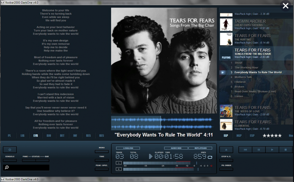 What, no love for Foobar? I'm using the DarkOne v4 skin. Foobar does have a bit of a learning curve, though, if you don't want it to look "basic". Foobar has extensions for getting CD info from multiple db's, as well as bios from last.fm. Both come with the DarkOne skin, I think. Not sure because I modded mine so I can't recall whether it was stock or mod. If you're looking to just tag your mp3's, I tend to use Mp3Tag but that's super old school.