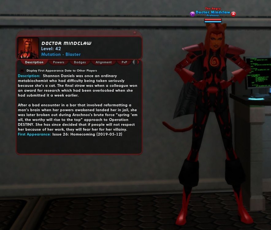 So having had a few days to let it roll around, I am changing my tune a bit on Mr. G and the clown show he had me bust out of jail. I completely stand by "the arc is cleaning up the mess his plan caused." However, I no longer see that as as big a deal, for a very simple reason: a supervillain of the kind of stature doing things of this scale, people are going to gun for you, even if they weren't already. So if they're gunning for you because you broke some people out of jail at the behest of a guy whose fat you pulled out of the fire, is it really that much worse than them gunning for you because of a plan that was 100% yours? I figure that any "this is your fault" that isn't offset by "I would have been in this kind of situation anyway" is handled by "and the cleanup is done on TV in front of an audience." The rest of the crew still mostly don't measure up to the trouble I got into by fetching them, but yeah, I can roll with "these guys just need to get their footing and then they can prove valuable, a thread which will not really get followed up on because this is an MMO based on comic books so that kind of thing is going uphill twice over." The writers for this can't really assume you've done any given thing, after all, and "a new writer takes over and drops the prior writer's work like a hot rock to tell their own stories" is not unknown in comicry. On a semi-personal note, I did kind of skim over the wiki beforehand so I had an idea of what I was getting into, and I wanted to do it with a specific character for a specific reason. See how he dismissively refers to Bobcat as just "the catgirl"? Didn't go over so hot. 😾 -