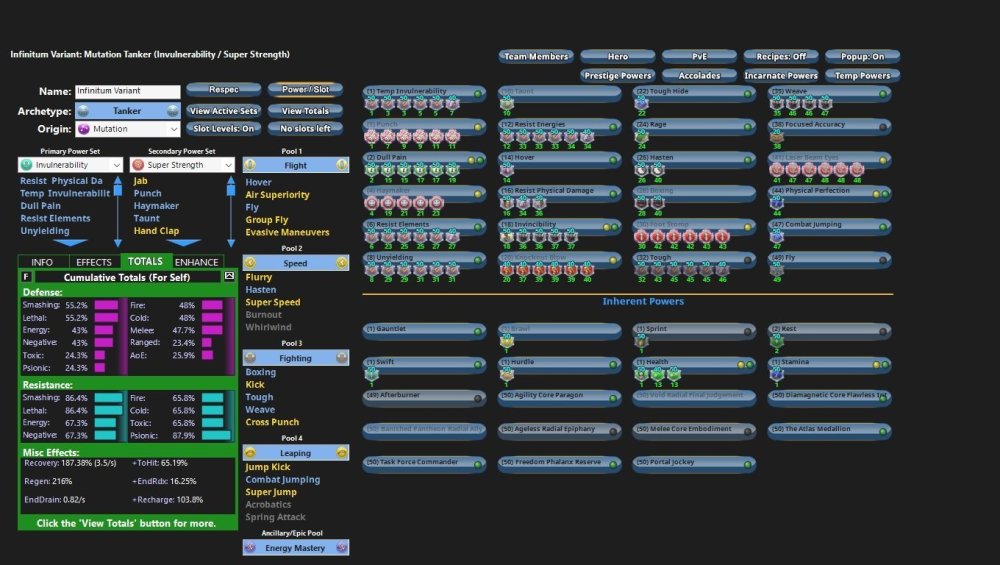 Okay, so I did some modifications to @Infinitum's build and I think this might be the one I take to the live servers. Wanted to see what you folks thought. o.o TEST3d - Infinitum - Tanker (Invulnerability - Super Strength).mbd